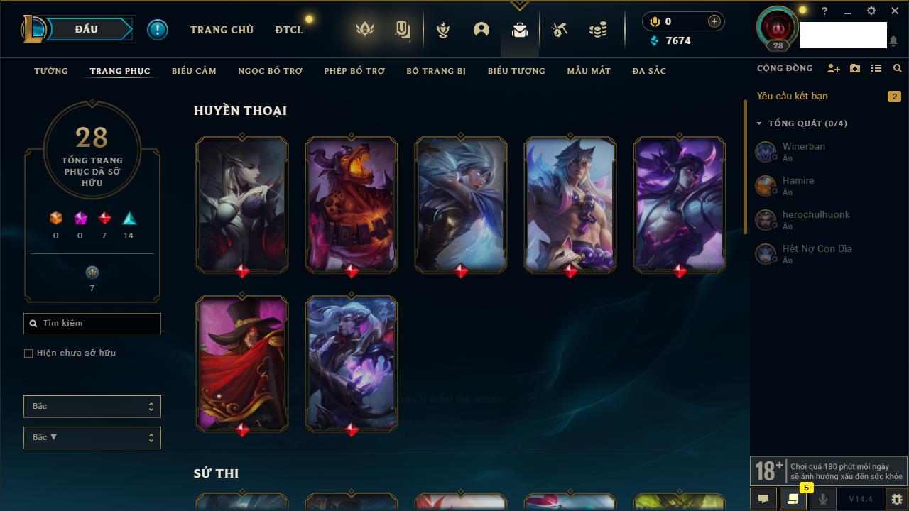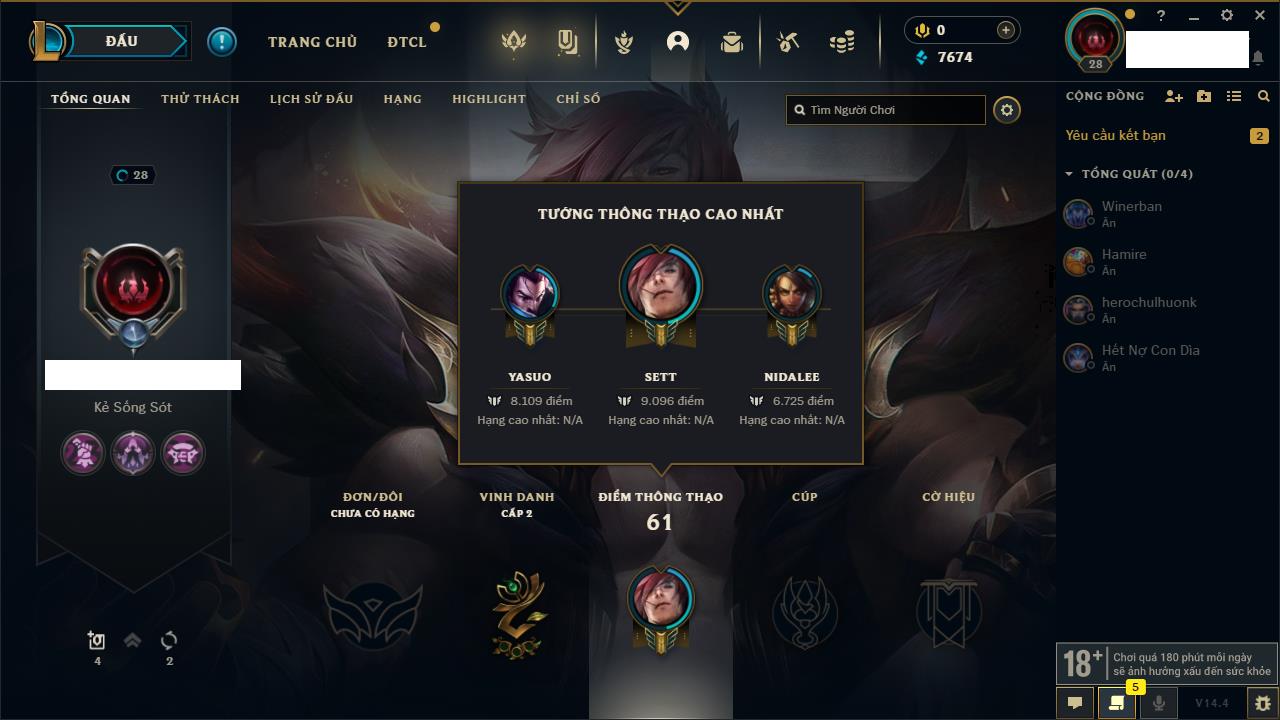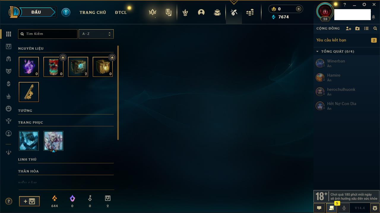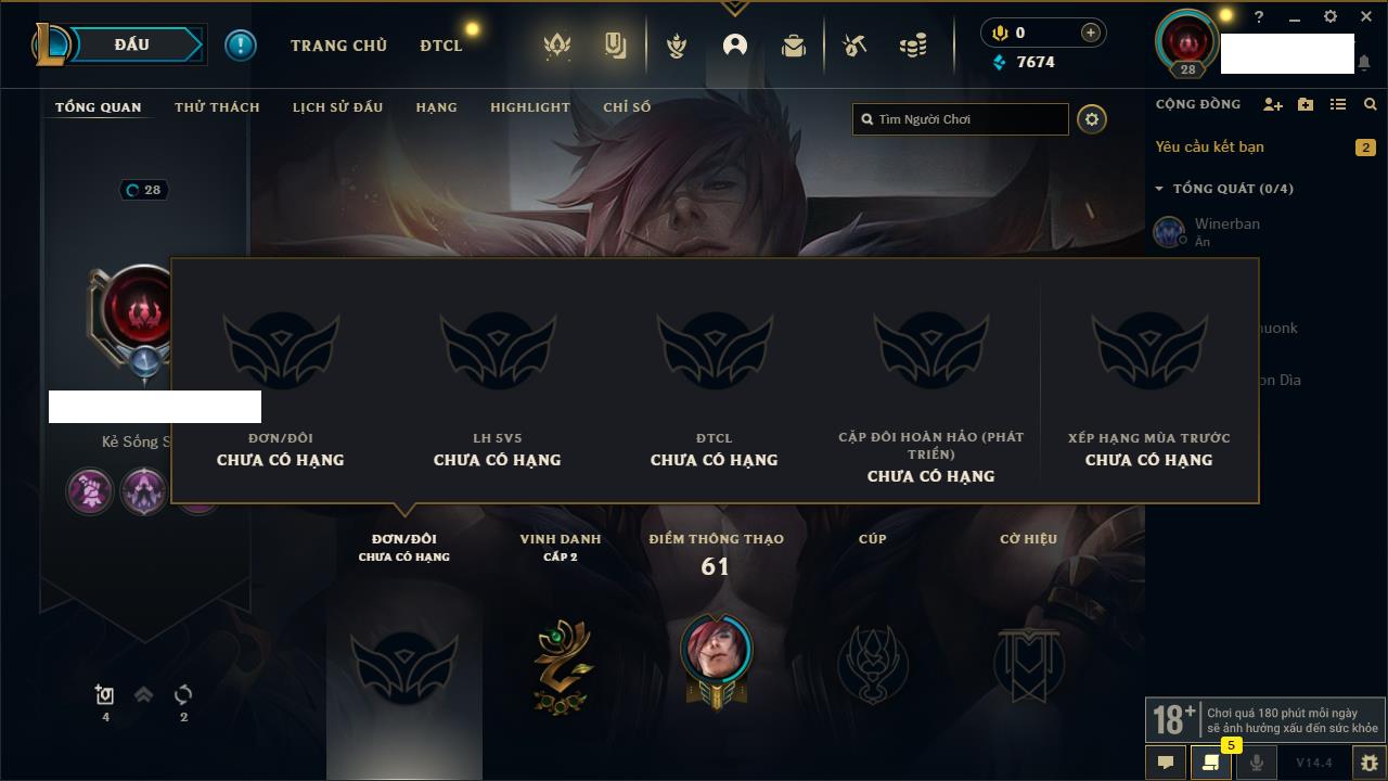 Rank Đơn: Vàng IIIKhung: BạcTướng: 56 - Còn 910 THXTrang Phục: 9Rank ĐTCL: Chưa RankLinh Thú: 31