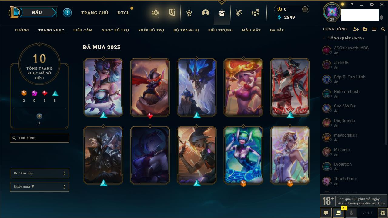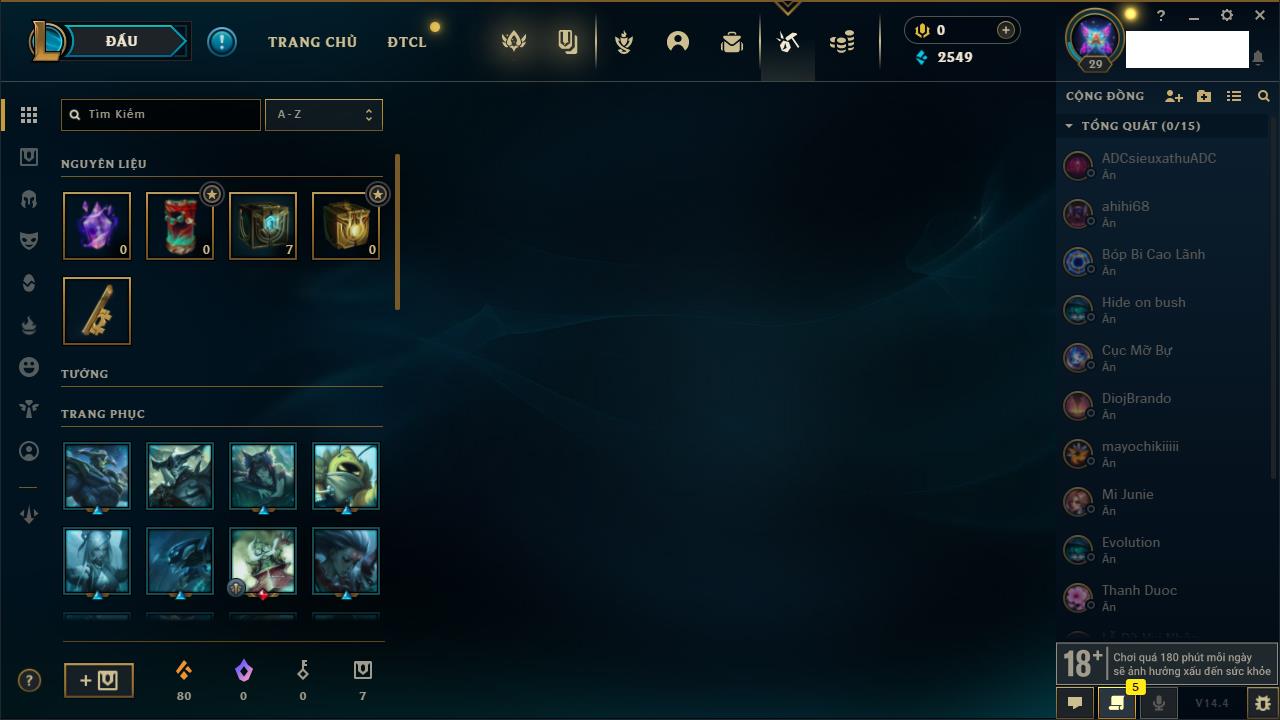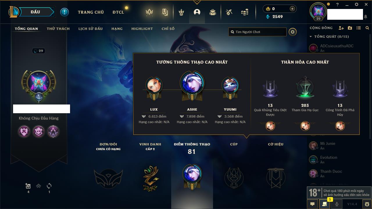 Rank Đơn: Sắt IIIKhung: Chưa có khungTướng: 88 - Còn 1376 THXTrang Phục: 12Rank ĐTCL: Bạc IVLinh Thú: 69