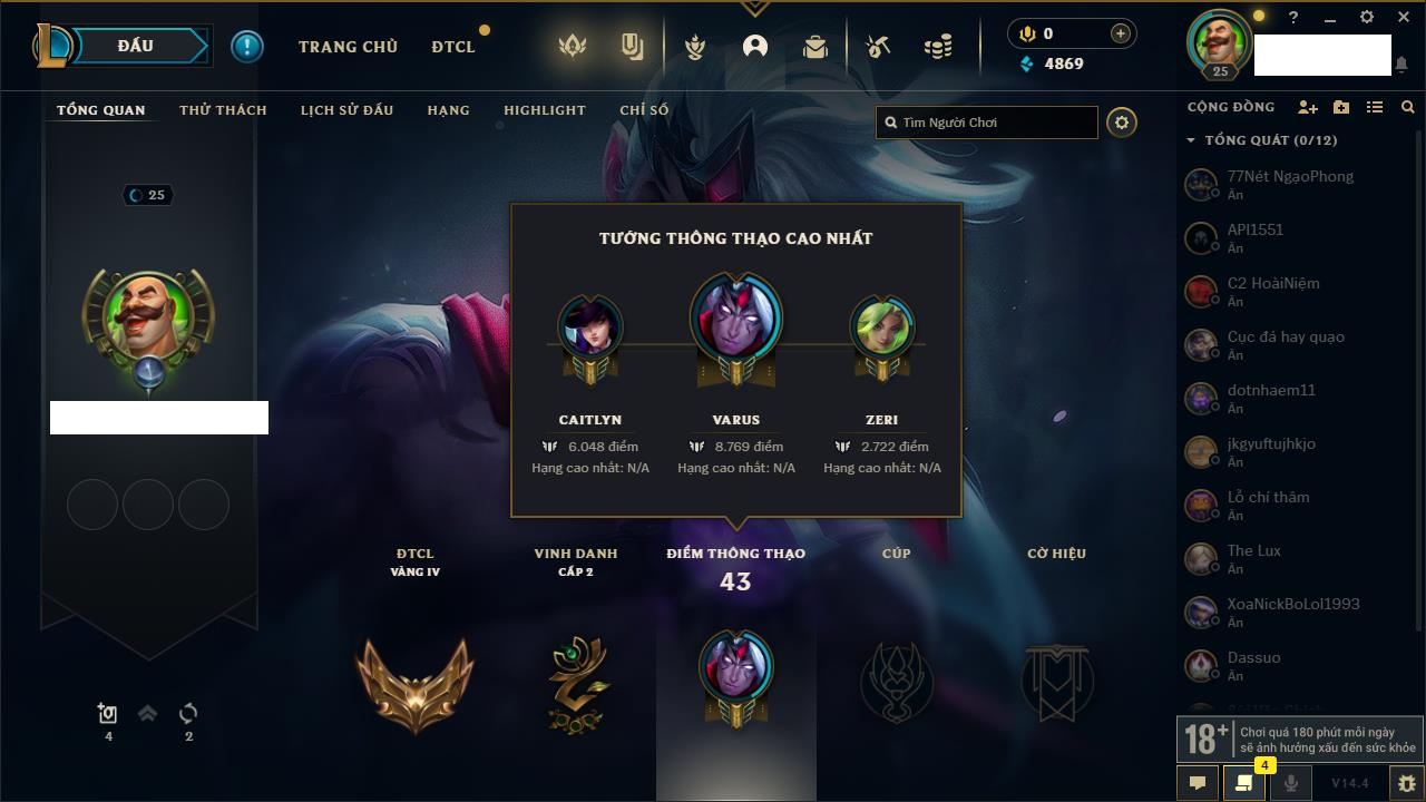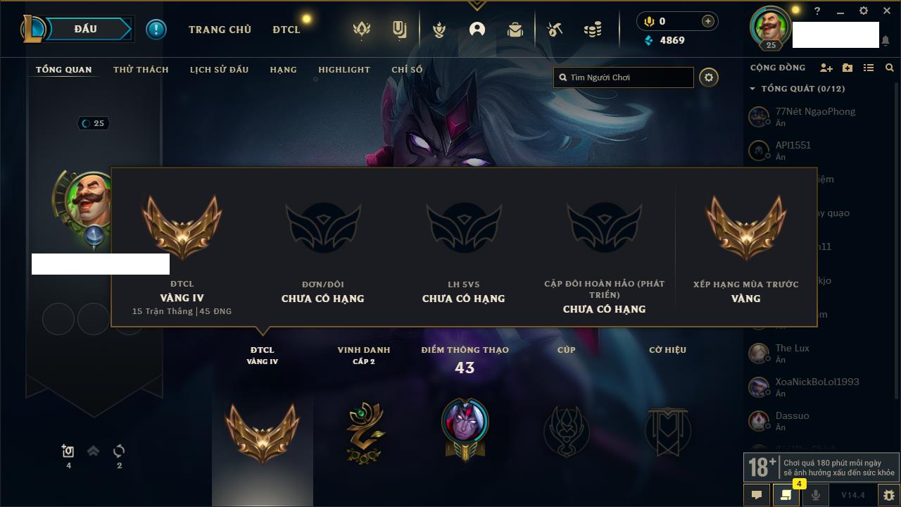 Rank Đơn: Vàng IIIKhung: VàngTướng: 77 - Còn 21172 THXTrang Phục: 8Rank ĐTCL: Kim Cương IIILinh Thú: 23