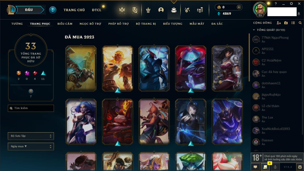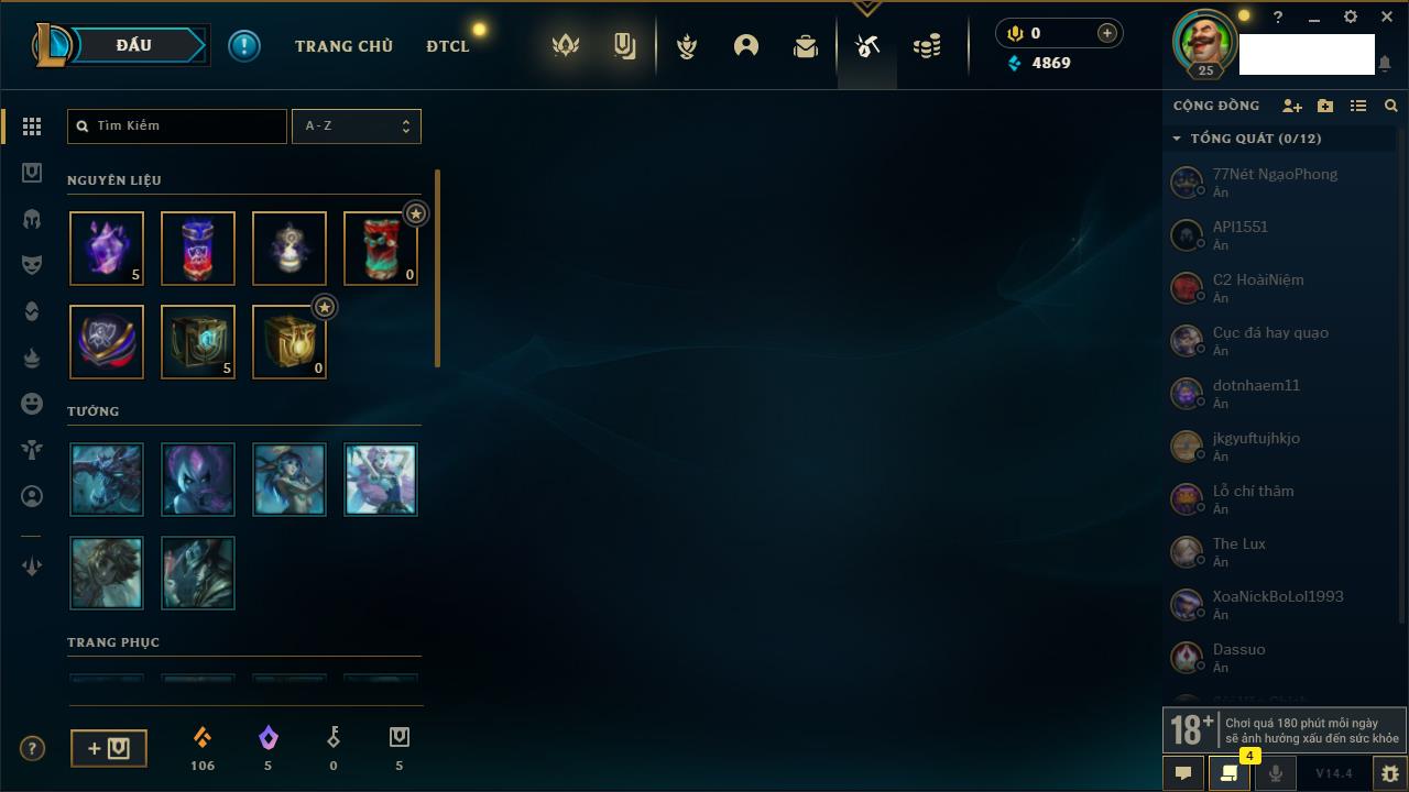 Rank Đơn: Chưa rank mùa nàoKhung: Chưa có khungTướng: 108 - Còn 6515 THXTrang Phục: 23Rank ĐTCL: Chưa RankLinh Thú: 111
