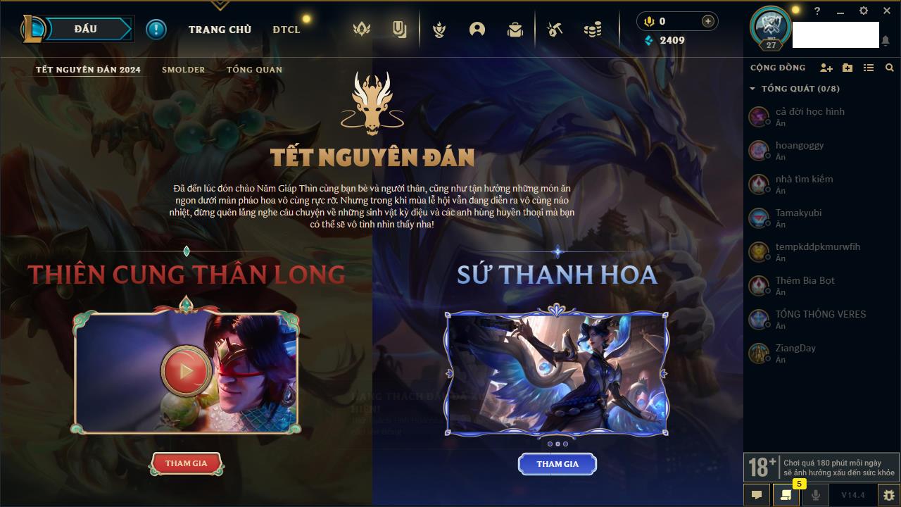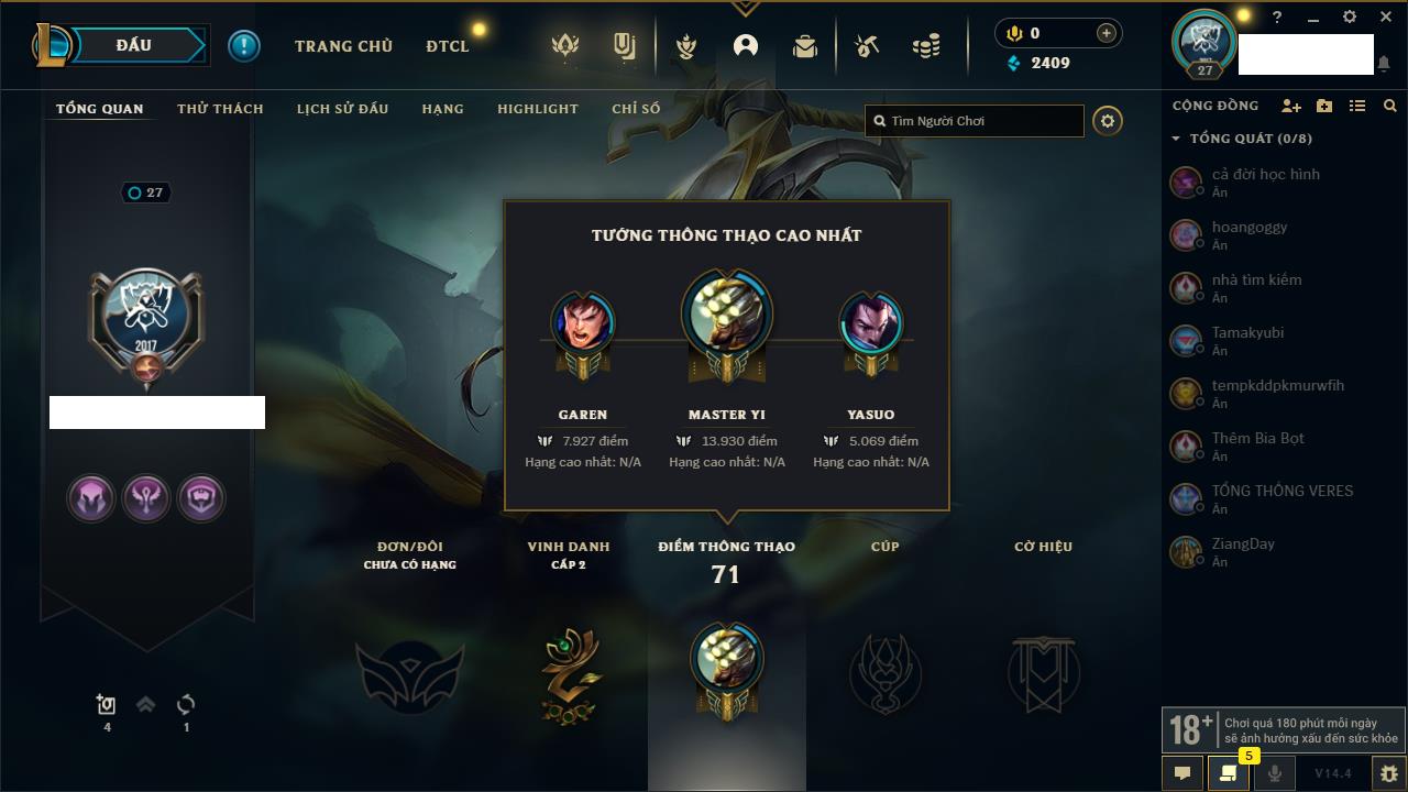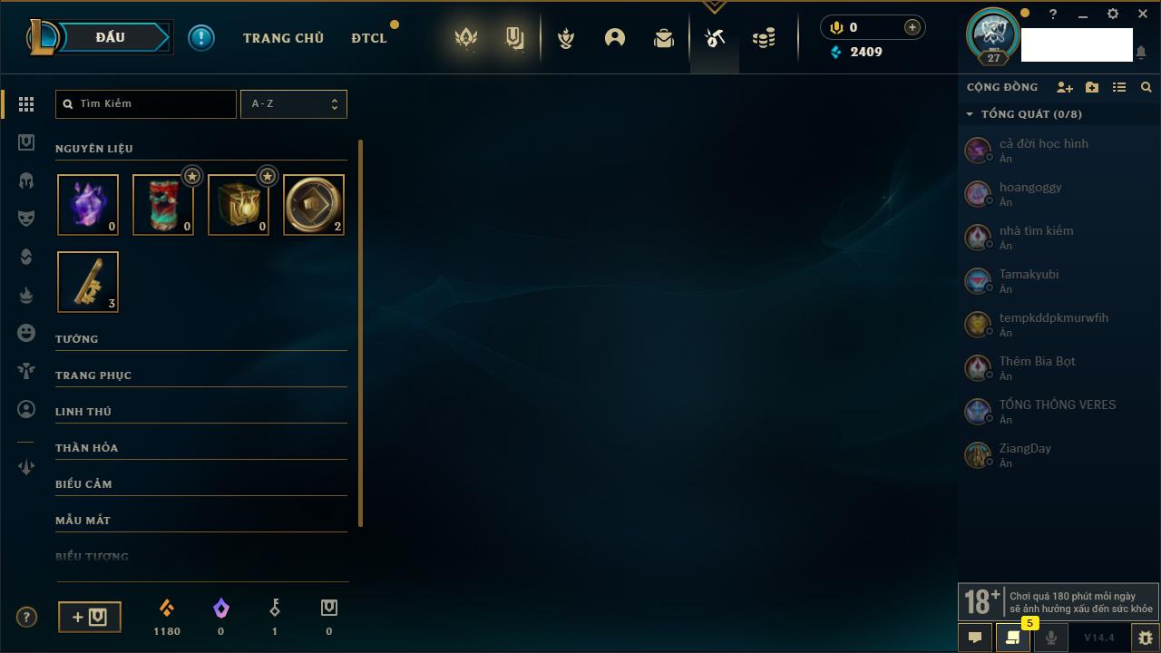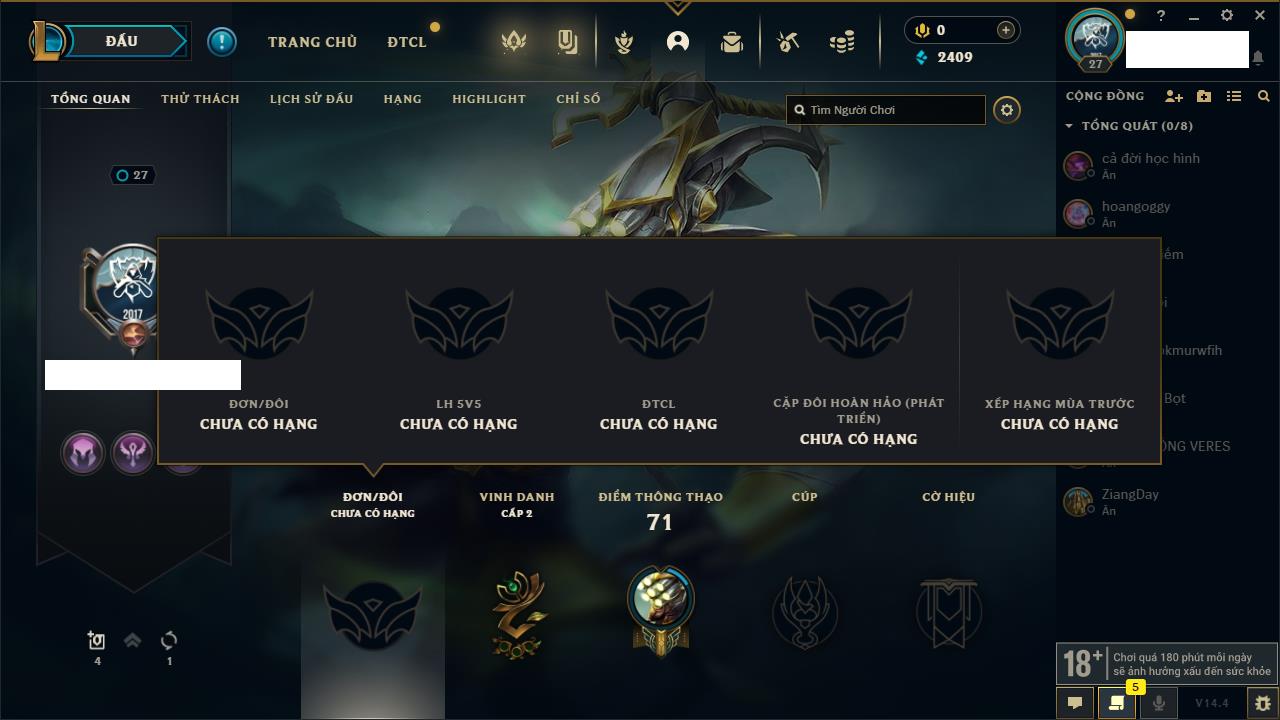 Rank Đơn: Chưa rank mùa nàoKhung: Chưa có khungTướng: 158 - Còn 10412 THXTrang Phục: 17Rank ĐTCL: Chưa RankLinh Thú: 114