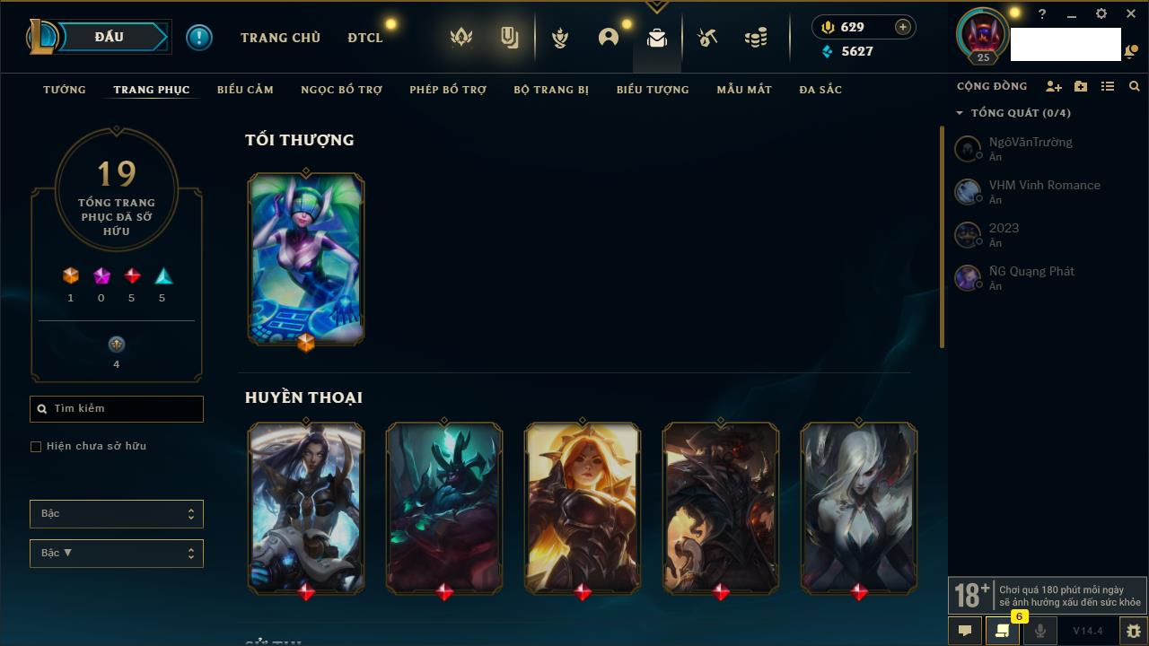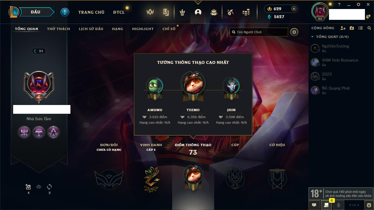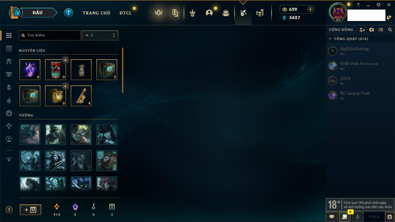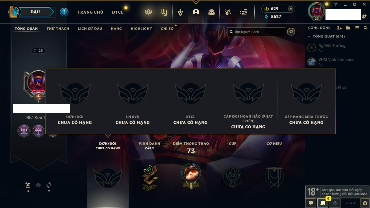 Rank Đơn: Đồng IIIKhung: Chưa có khungTướng: 86 - Còn 14367 THXTrang Phục: 19Rank ĐTCL: Vàng IIILinh Thú: 95
