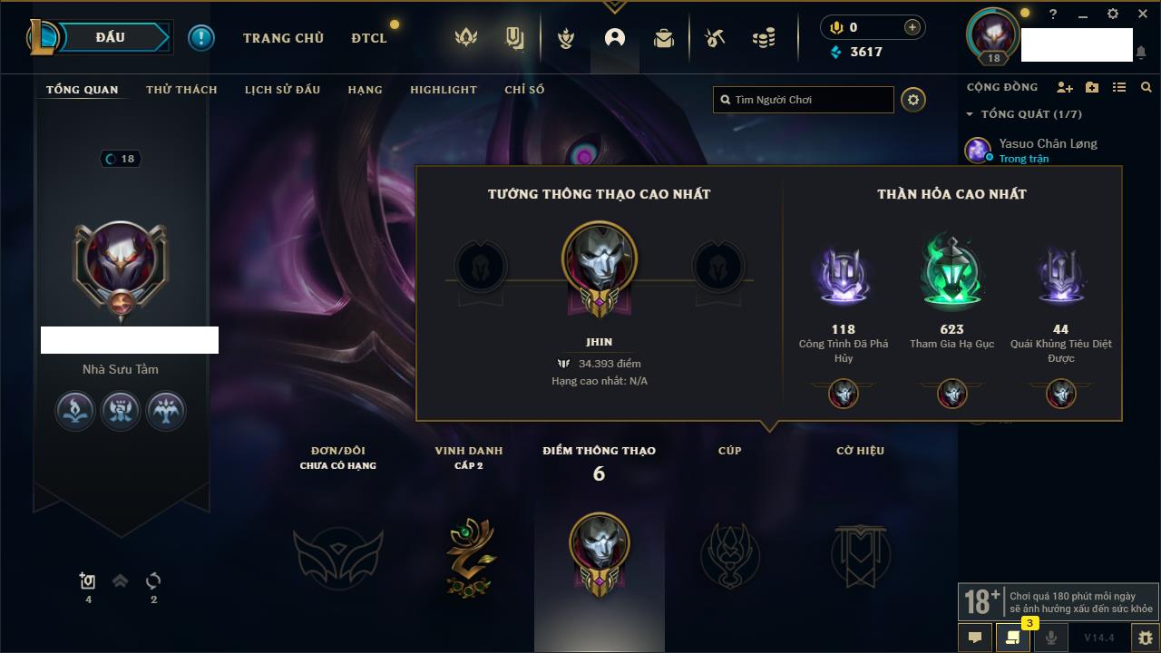 Rank Đơn: Chưa rank mùa nàoKhung: Chưa có khungTướng: 159 - Còn 15030 THXTrang Phục: 5Rank ĐTCL: Chưa RankLinh Thú: 51