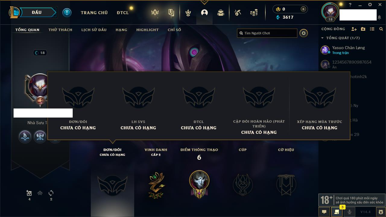 Rank Đơn: Chưa rank mùa nàoKhung: Chưa có khungTướng: 157 - Còn 12765 THXTrang Phục: 3Rank ĐTCL: Chưa RankLinh Thú: 78