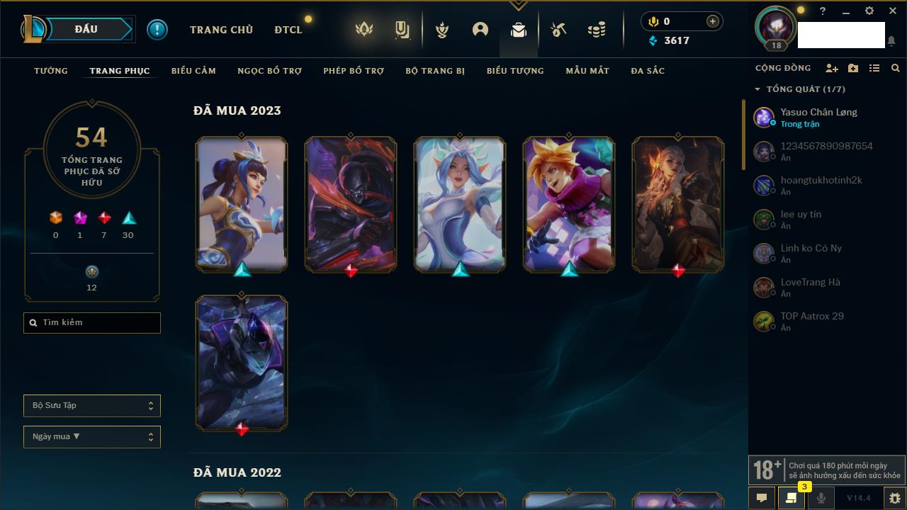 Rank Đơn: Chưa rank mùa nàoKhung: Chưa có khungTướng: 166 - Còn 3090 THXTrang Phục: 9Rank ĐTCL: Chưa RankLinh Thú: 125