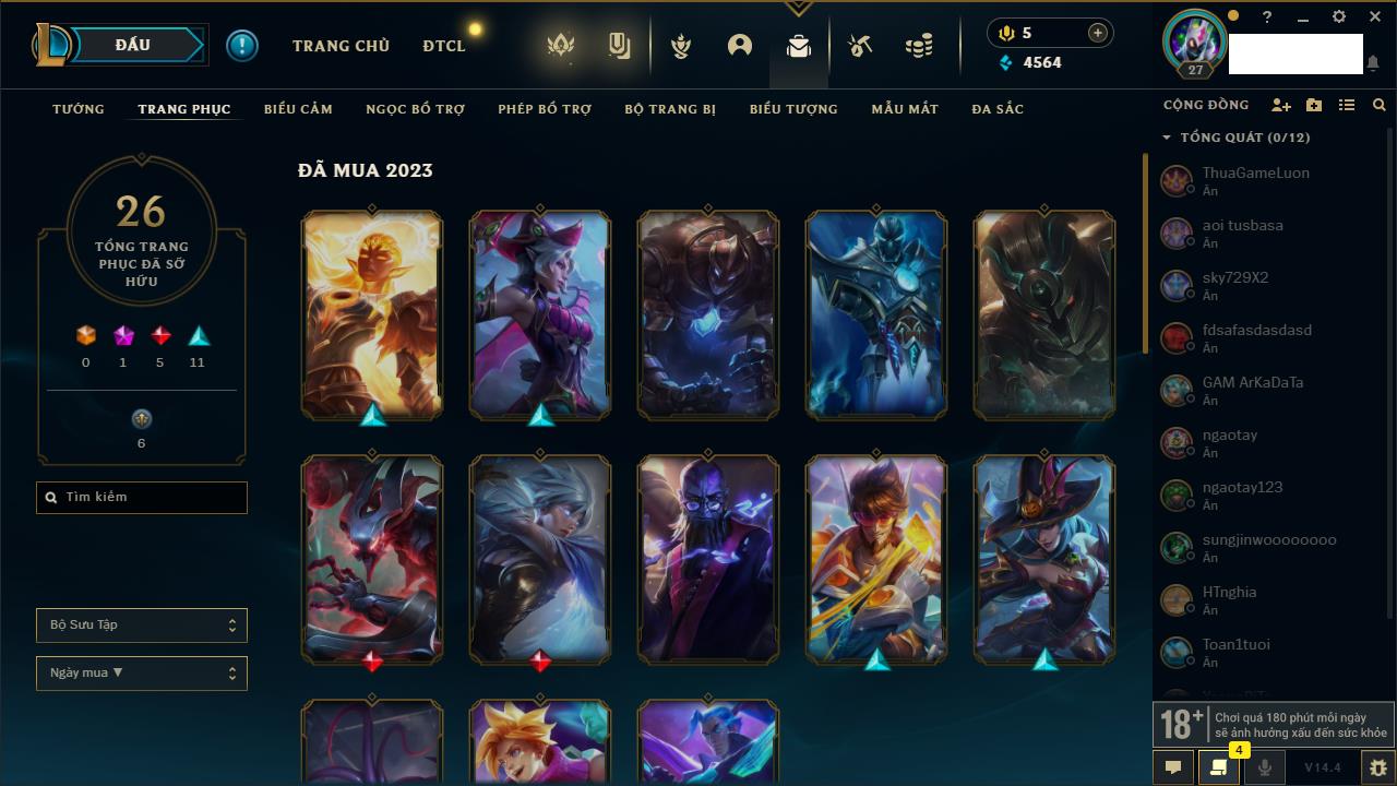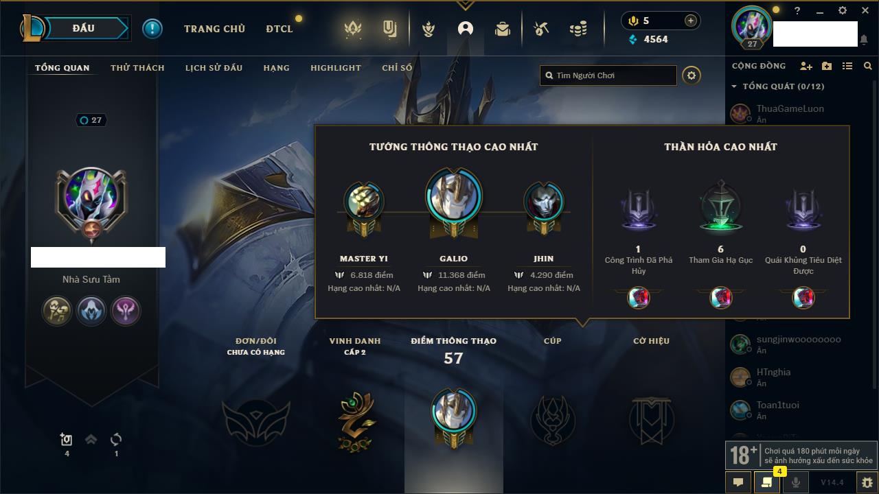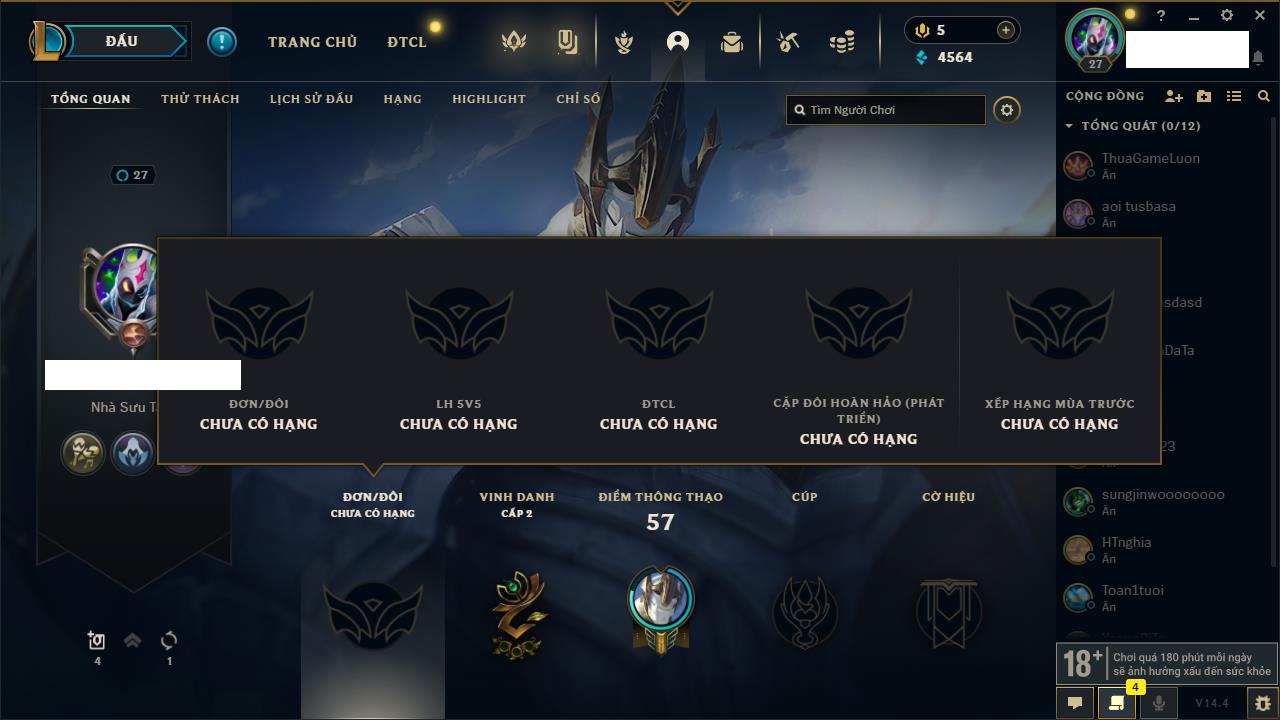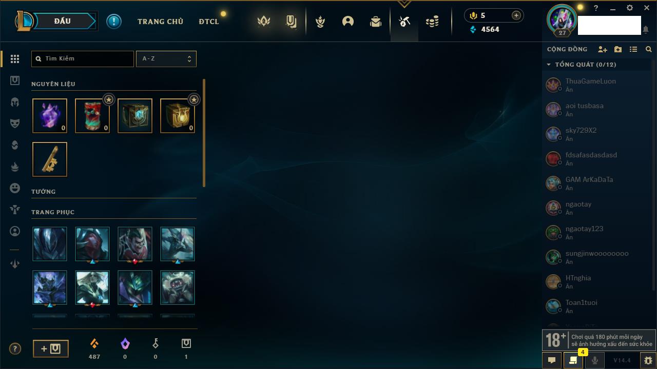Rank Đơn: Sắt IIIKhung: Chưa có khungTướng: 77 - Còn 8133 THXTrang Phục: 11Rank ĐTCL: Bạch Kim IVLinh Thú: 108