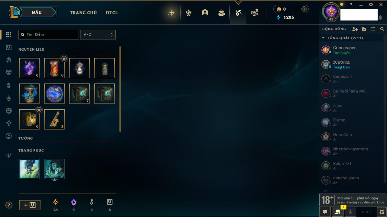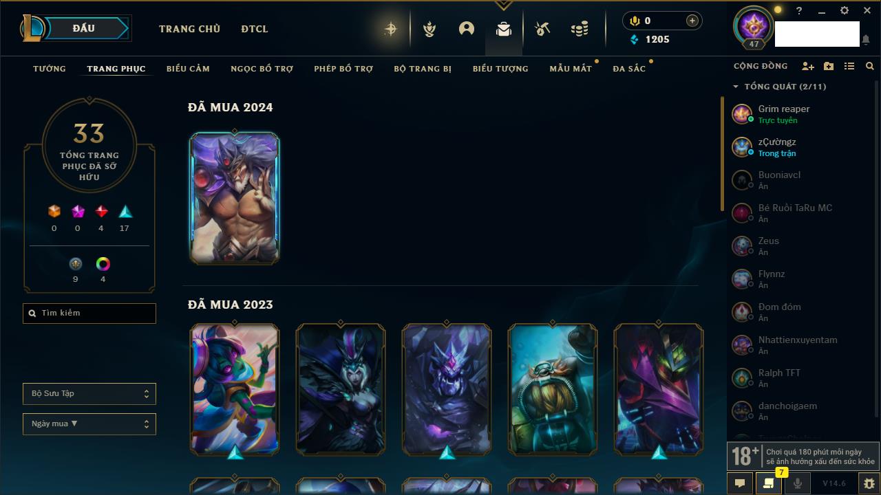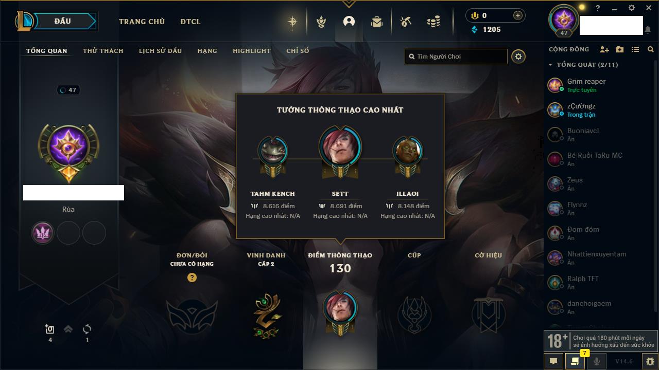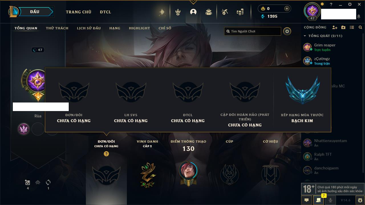 Rank Đơn: Vàng IIIKhung: BạcTướng: 56 - Còn 910 THXTrang Phục: 9Rank ĐTCL: Chưa RankLinh Thú: 31