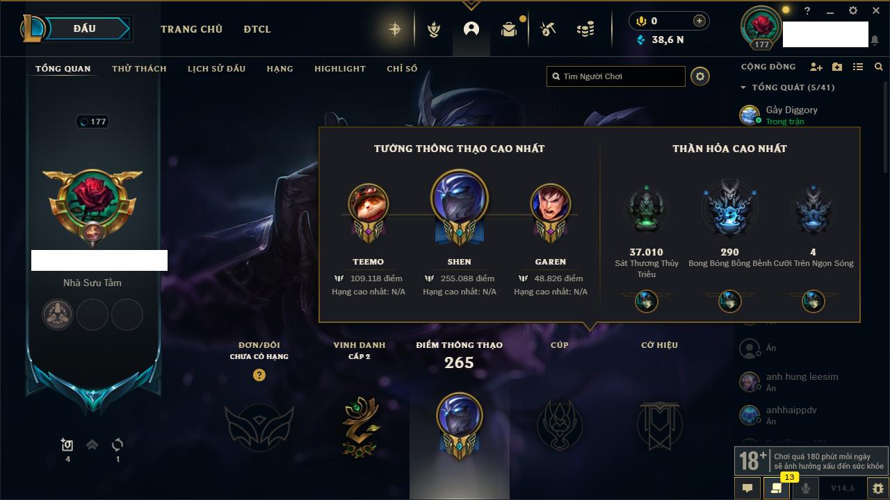 Rank Đơn: Chưa rank mùa nàoKhung: Chưa có khungTướng: 12 - Còn 3853 THXTrang Phục: 2Rank ĐTCL: Chưa RankLinh Thú: 30