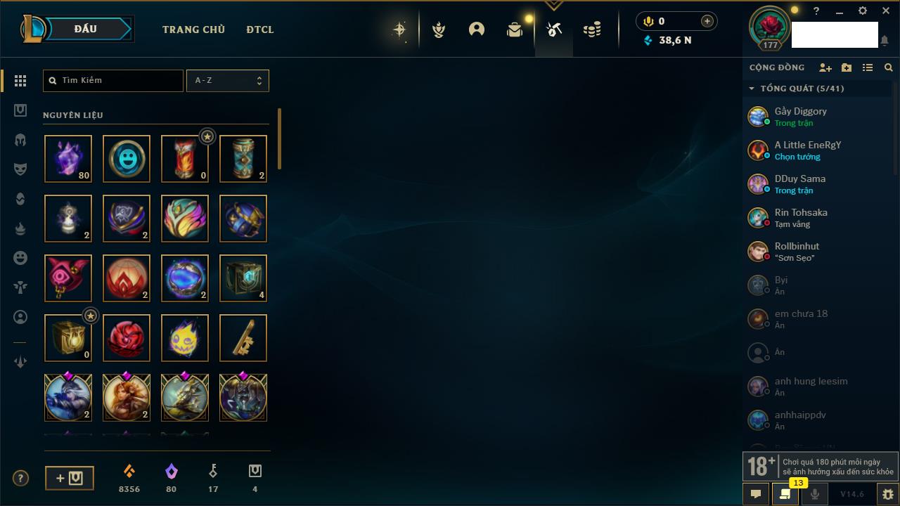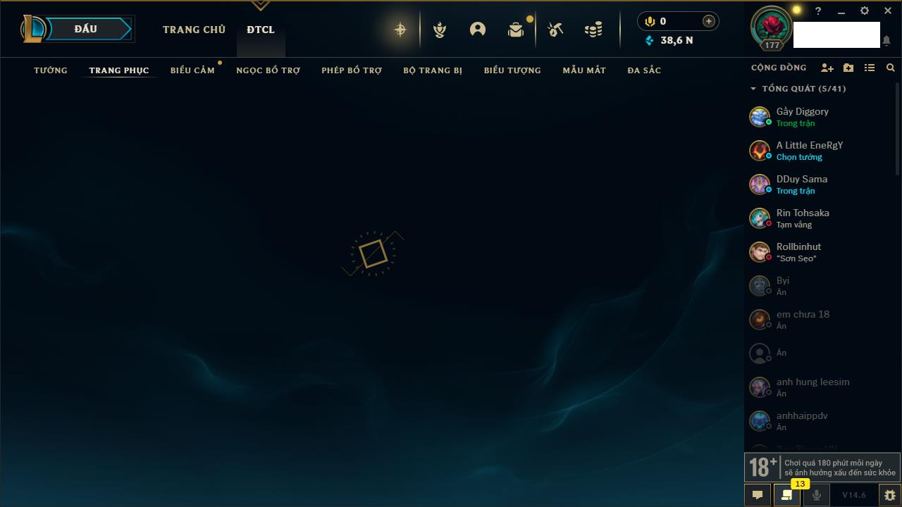 Rank Đơn: Vàng IIIKhung: VàngTướng: 77 - Còn 21172 THXTrang Phục: 8Rank ĐTCL: Kim Cương IIILinh Thú: 23
