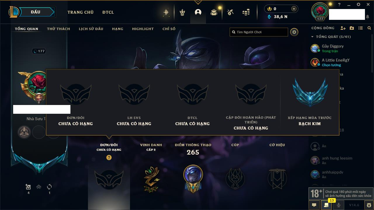Rank Đơn: Vàng IIIKhung: BạcTướng: 56 - Còn 910 THXTrang Phục: 9Rank ĐTCL: Chưa RankLinh Thú: 31