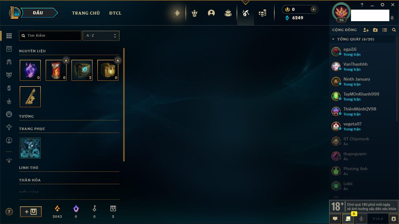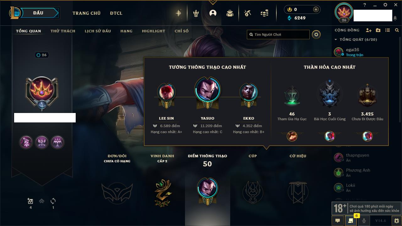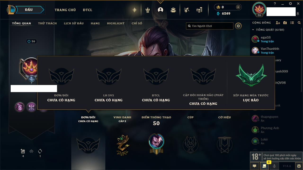 Rank Đơn: Sắt IKhung: SắtTướng: 53 - Còn 21317 THXTrang Phục: 9Rank ĐTCL: Sắt ILinh Thú: 82