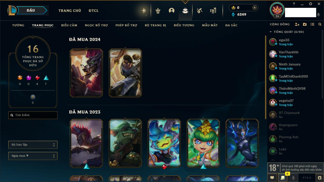 Rank Đơn: Đồng IIIKhung: Chưa có khungTướng: 86 - Còn 14367 THXTrang Phục: 19Rank ĐTCL: Vàng IIILinh Thú: 95