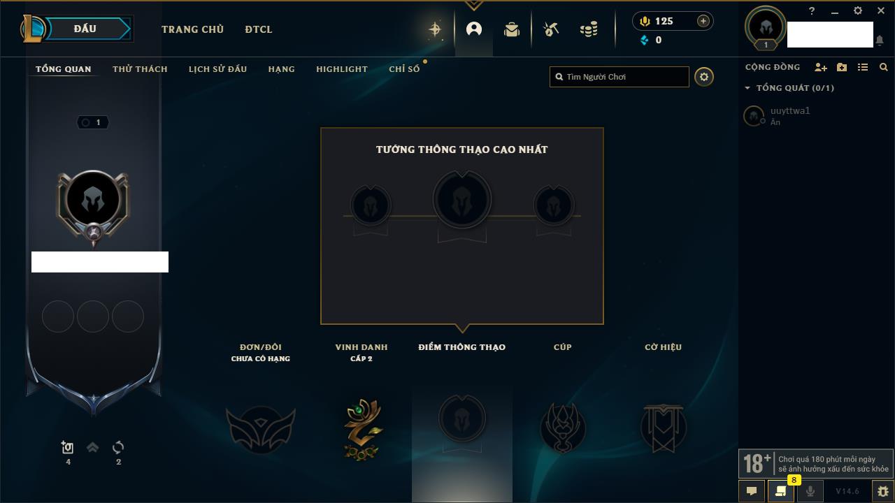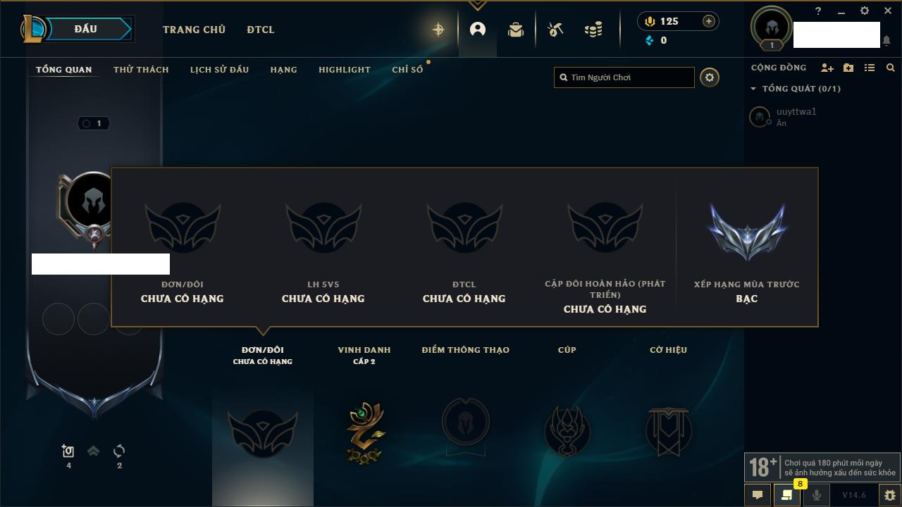 Rank Đơn: Bạc III Khung: Bạc Tướng: 170 - Còn 30078 THX Trang Phục: 225 Rank ĐTCL: Chưa Rank Linh Thú: 138