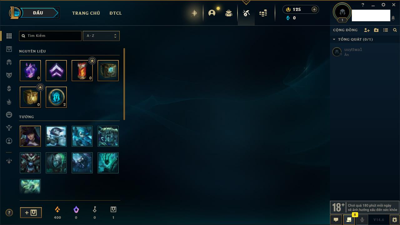 Rank Đơn: Chưa rank mùa nào Khung: Chưa có khung Tướng: 3 - Còn 3800 THX Trang Phục: 0 Rank ĐTCL: Chưa Rank Linh Thú: 31
