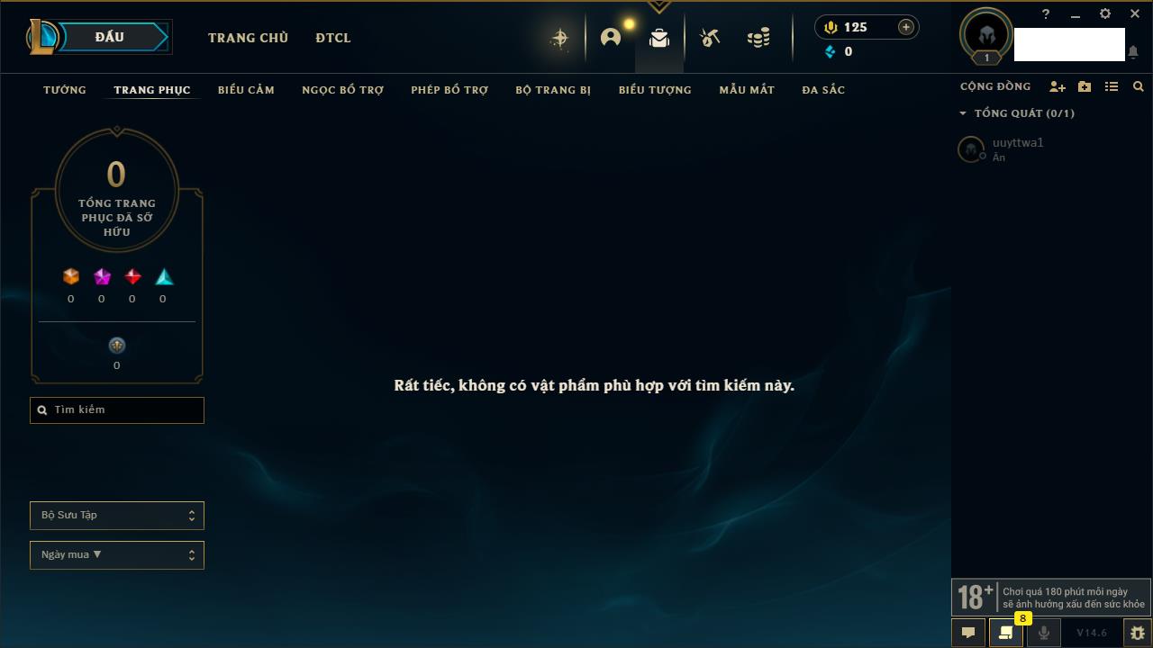 Rank Đơn: Chưa rank mùa nào Khung: Chưa có khung Tướng: 0 - Còn 0 THX Trang Phục: 0 Rank ĐTCL: Chưa Rank Linh Thú: 5