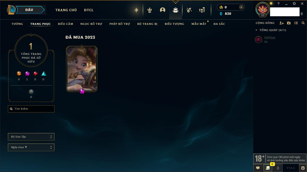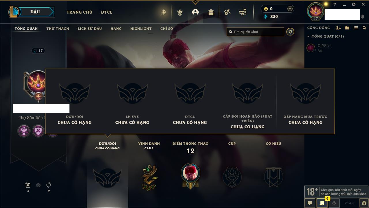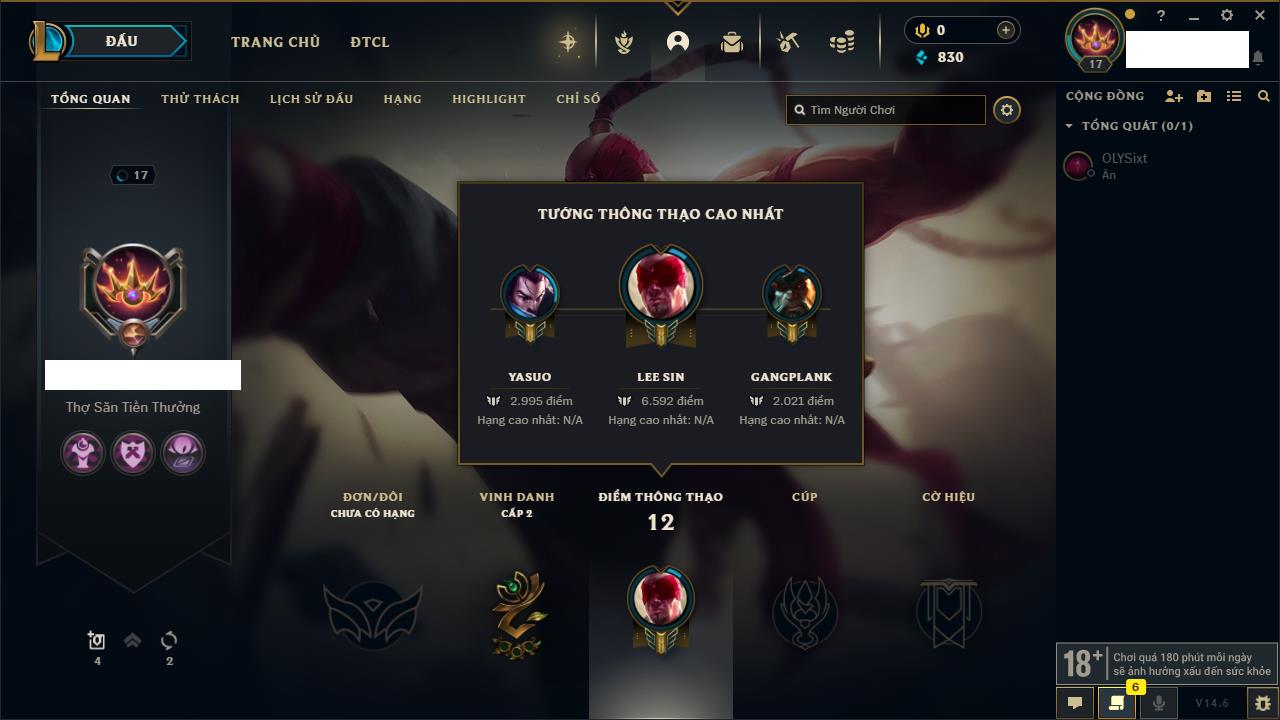 Rank Đơn: Chưa rank mùa nàoKhung: Chưa có khungTướng: 0 - Còn 7200 THXTrang Phục: 0Rank ĐTCL: Chưa RankLinh Thú: 11