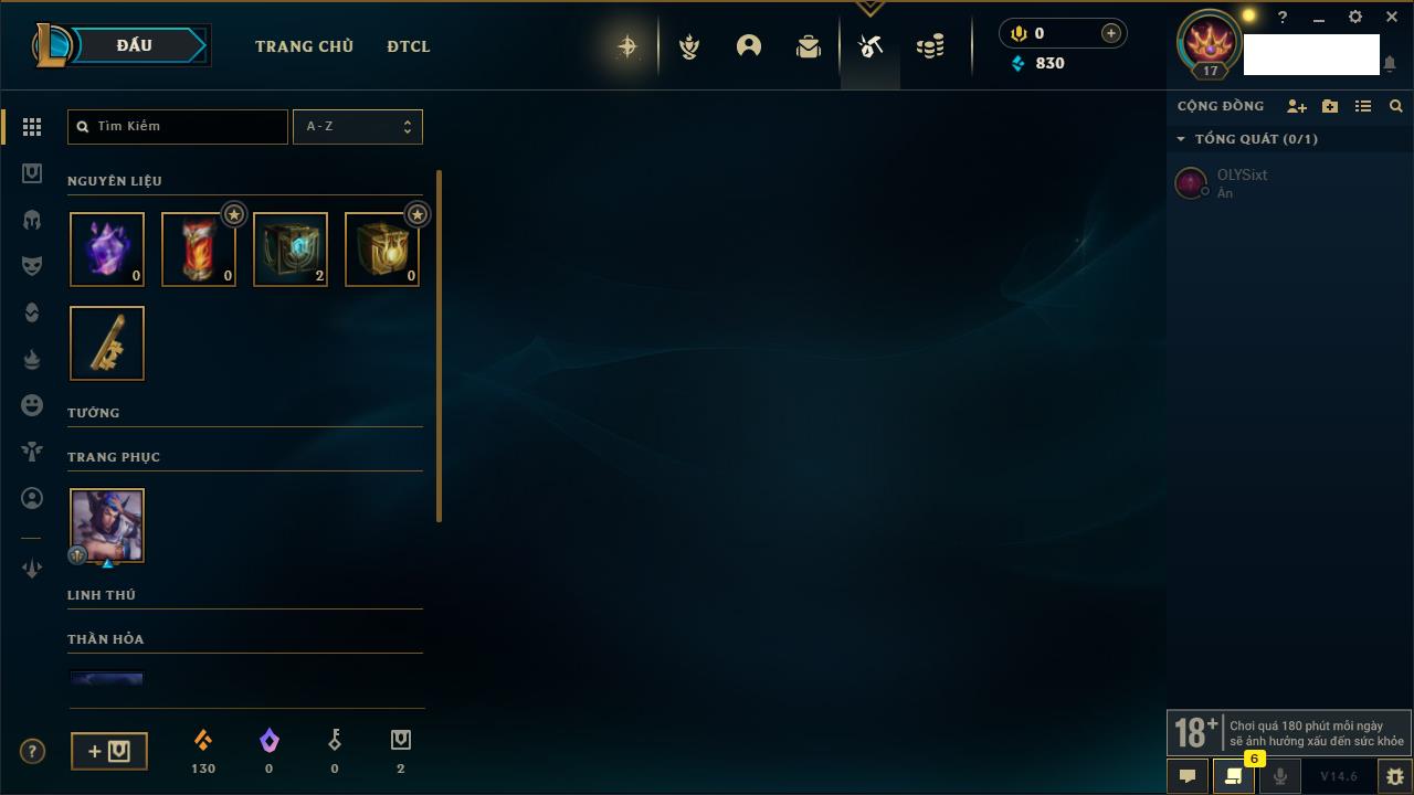 Rank Đơn: Chưa rank mùa nàoKhung: Chưa có khungTướng: 0 - Còn 3000 THXTrang Phục: 0Rank ĐTCL: Bạch Kim IVLinh Thú: 11