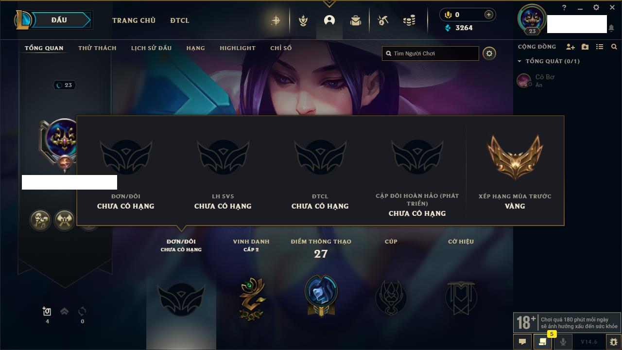 Rank Đơn: Chưa rank mùa nàoKhung: Chưa có khungTướng: 147 - Còn 8700 THXTrang Phục: 0Rank ĐTCL: Chưa RankLinh Thú: 1