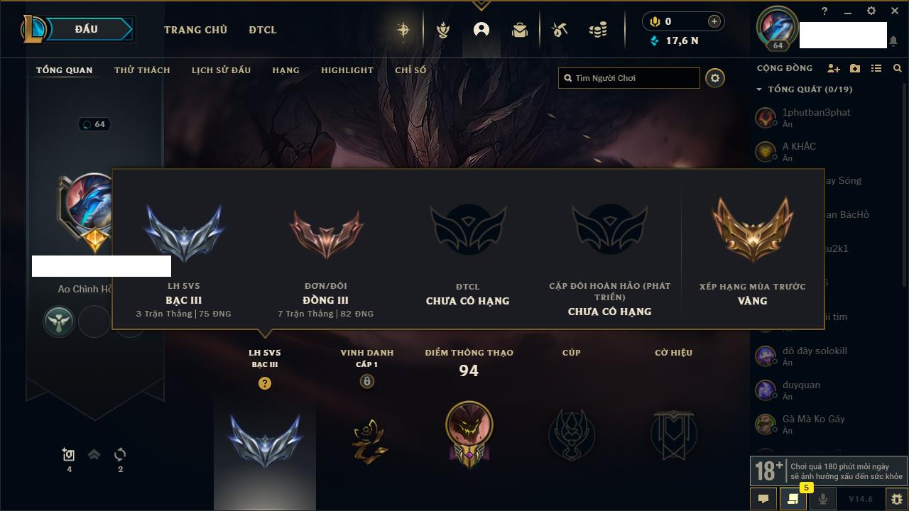 Rank Đơn: Bạc IV Khung: Bạc Tướng: 64 - Còn 5901 THX Trang Phục: 17 Rank ĐTCL: Chưa Rank Linh Thú: 105