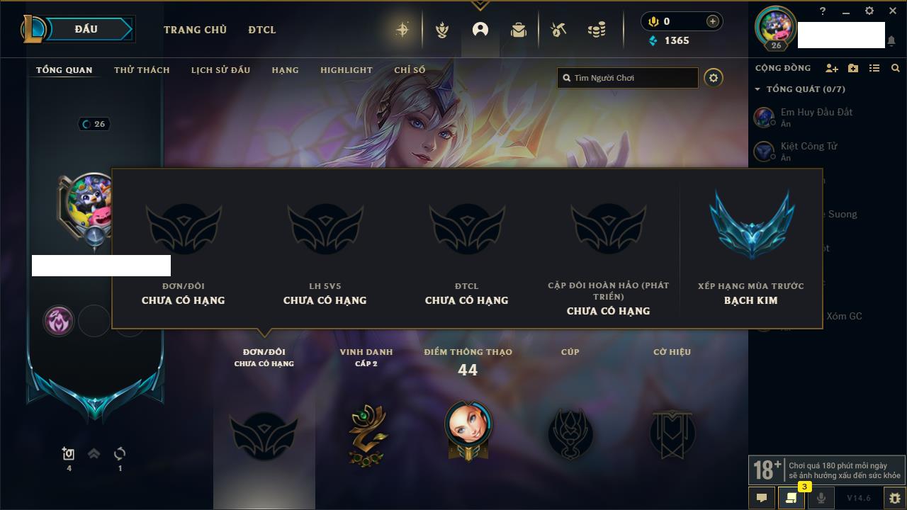 Rank Đơn: Chưa rank mùa nàoKhung: Chưa có khungTướng: 38 - Còn 6280 THXTrang Phục: 2Rank ĐTCL: Chưa RankLinh Thú: 50