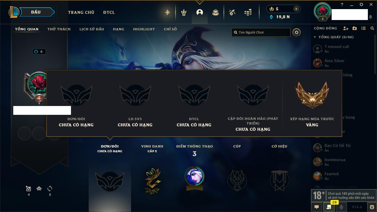 Rank Đơn: Chưa rank mùa nàoKhung: Chưa có khungTướng: 157 - Còn 19815 THXTrang Phục: 5Rank ĐTCL: Chưa RankLinh Thú: 134