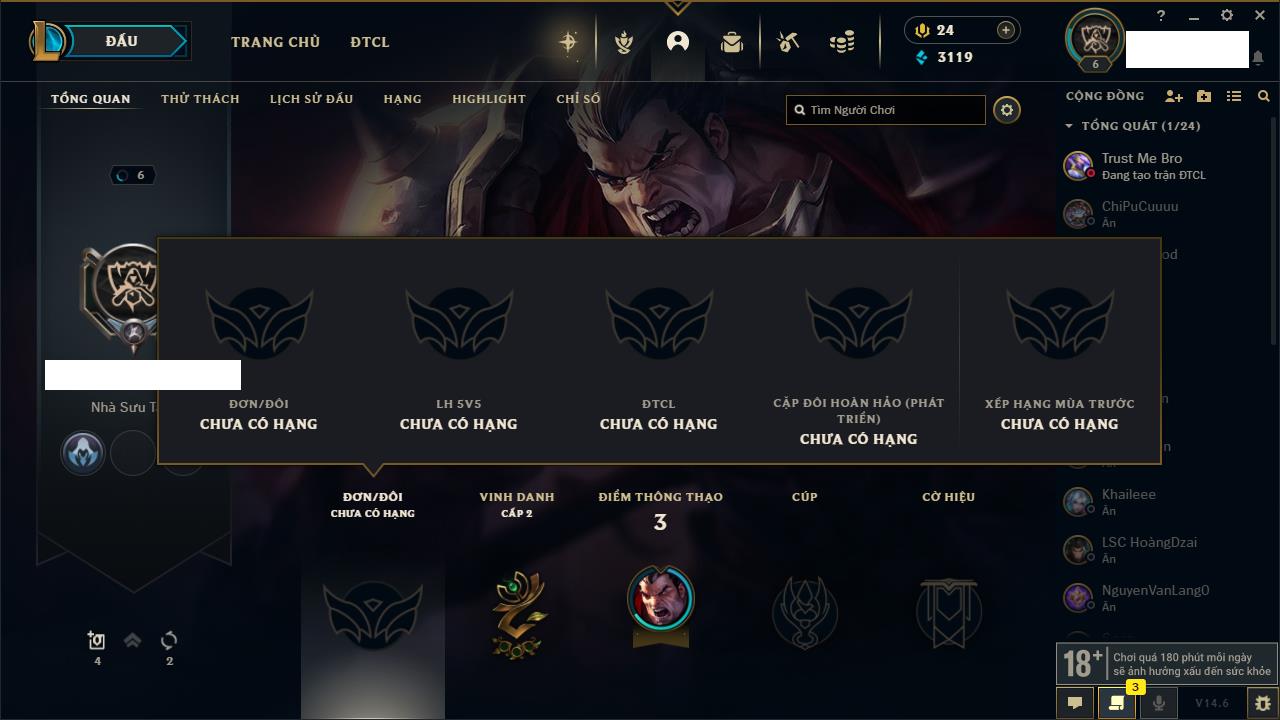 Rank Đơn: Chưa rank mùa nàoKhung: Chưa có khungTướng: 157 - Còn 3119 THXTrang Phục: 0Rank ĐTCL: Chưa RankLinh Thú: 41