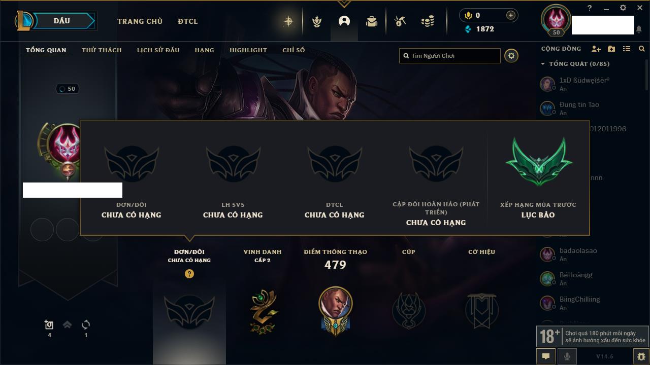 Rank Đơn: Chưa RankKhung: Chưa có khungTướng: 3 - Còn 34550 THXTrang Phục: 0Rank ĐTCL: Chưa RankLinh Thú: 41
