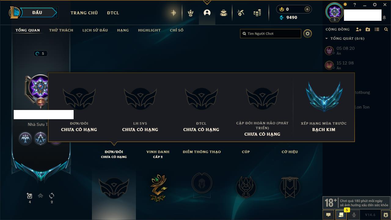 Rank Đơn: Chưa rank mùa nào Khung: Chưa có khung Tướng: 0 - Còn 2000 THX Trang Phục: 0 Rank ĐTCL: Chưa Rank Linh Thú: 14