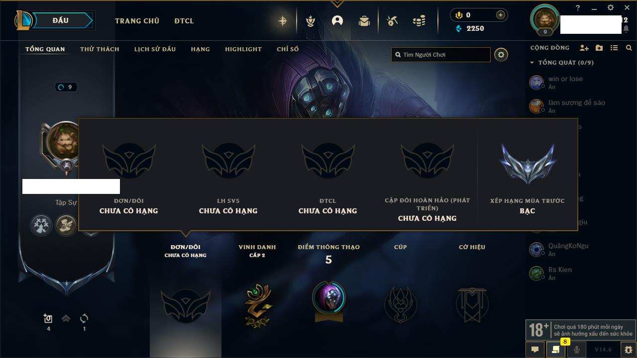 Rank Đơn: Chưa RankKhung: Chưa có khungTướng: 2 - Còn 3450 THXTrang Phục: 0Rank ĐTCL: Chưa RankLinh Thú: 7