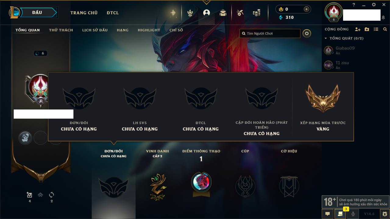 Rank Đơn: Chưa rank mùa nào Khung: Chưa có khung Tướng: 0 - Còn 2000 THX Trang Phục: 0 Rank ĐTCL: Chưa Rank Linh Thú: 14