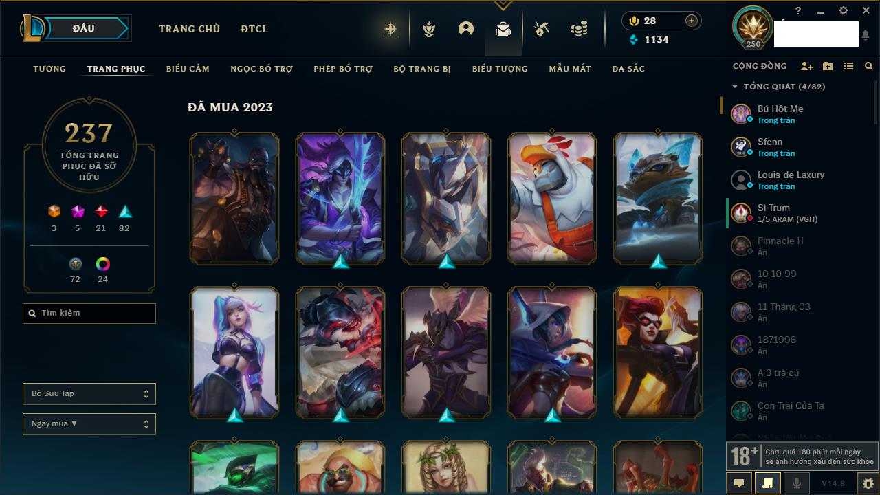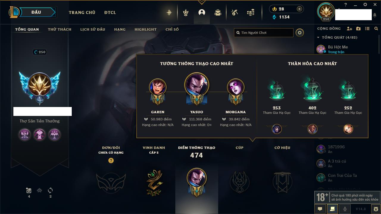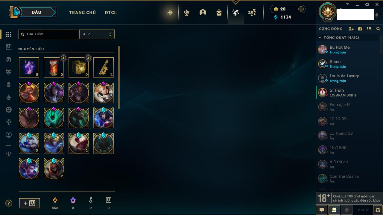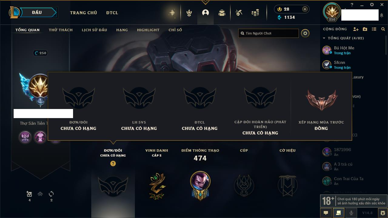 Rank Đơn: Vàng IIIKhung: BạcTướng: 171 - Còn 101359 THXTrang Phục: 88Rank ĐTCL: Kim Cương IVLinh Thú: 200