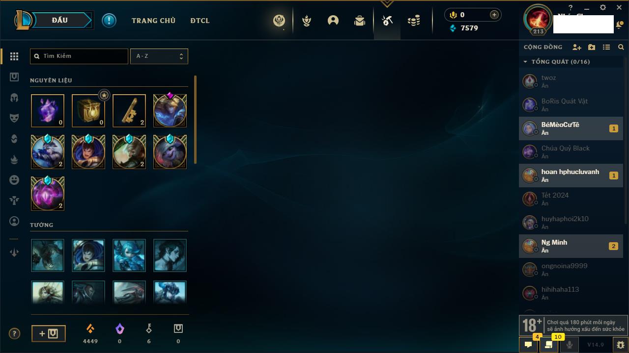 Rank Đơn: Vàng IVKhung: VàngTướng: 146 - Còn 89110 THXTrang Phục: 63Rank ĐTCL: Vàng IIILinh Thú: 41
