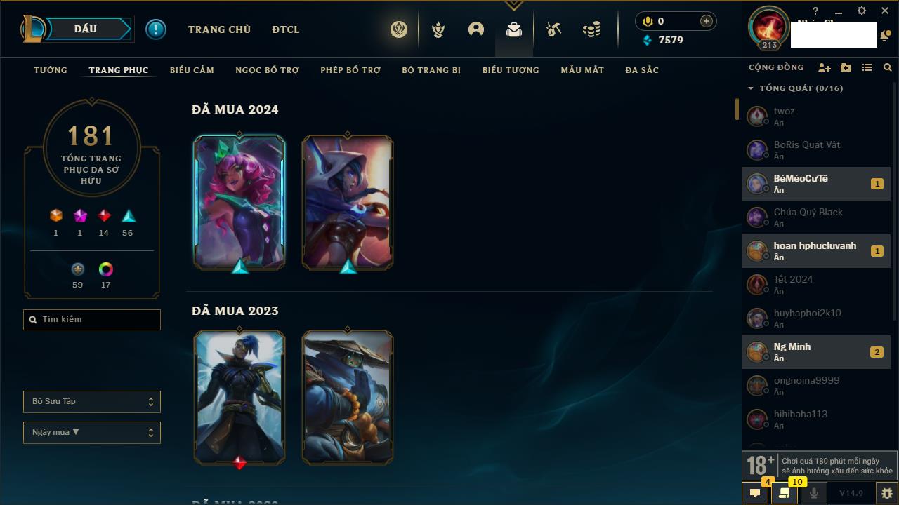 Rank Đơn: Đồng IIKhung: Chưa có khungTướng: 170 - Còn 56487 THXTrang Phục: 90Rank ĐTCL: Chưa RankLinh Thú: 129