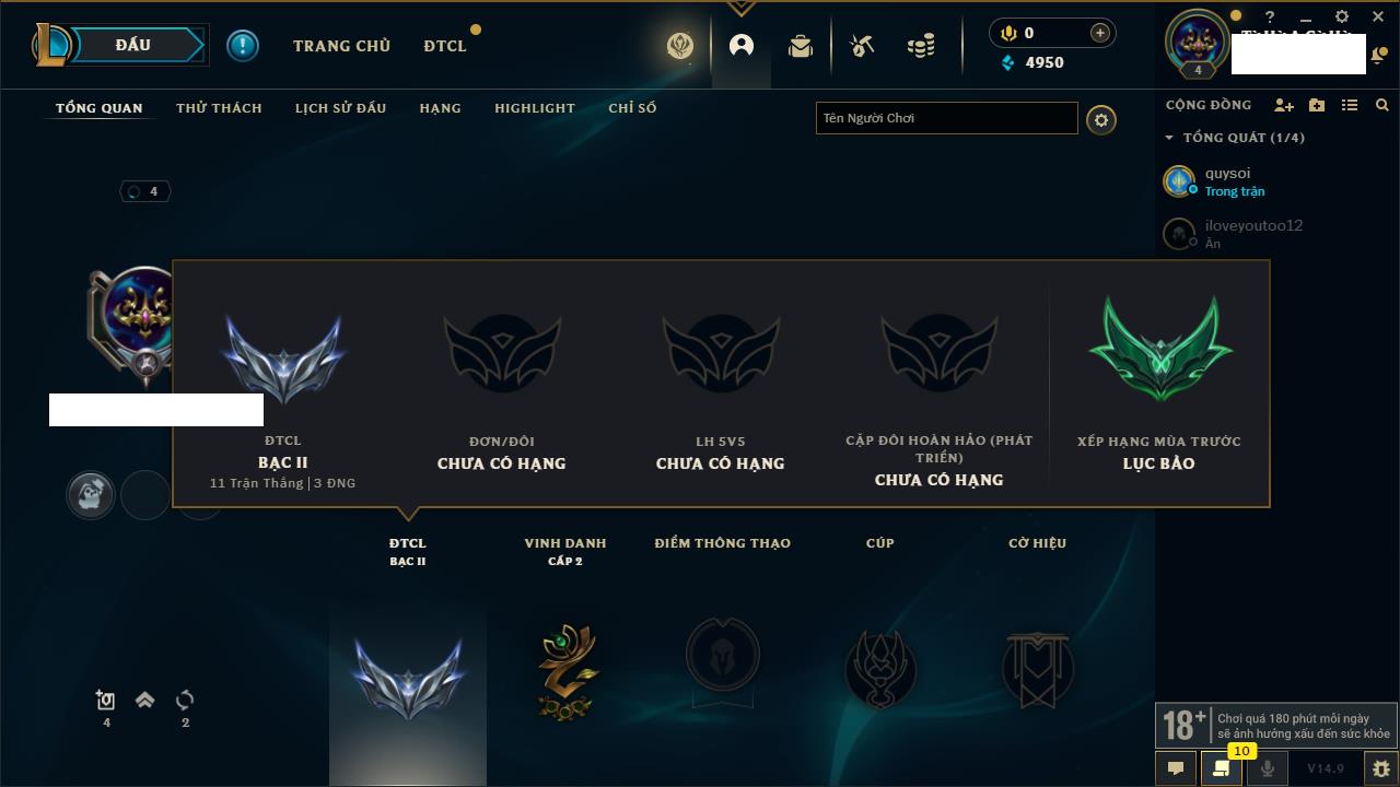 Rank Đơn: Chưa rank mùa nàoKhung: Chưa có khungTướng: 2 - Còn 9000 THXTrang Phục: 0Rank ĐTCL: Bạch Kim IIILinh Thú: 31