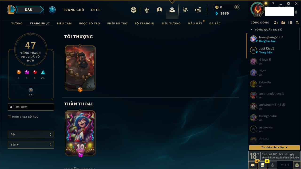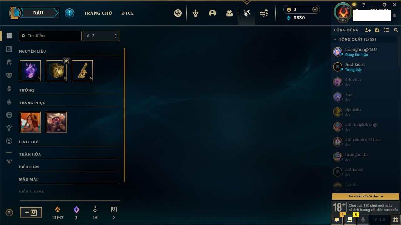 Rank Đơn: Đồng IIKhung: Chưa có khungTướng: 170 - Còn 56487 THXTrang Phục: 90Rank ĐTCL: Chưa RankLinh Thú: 129