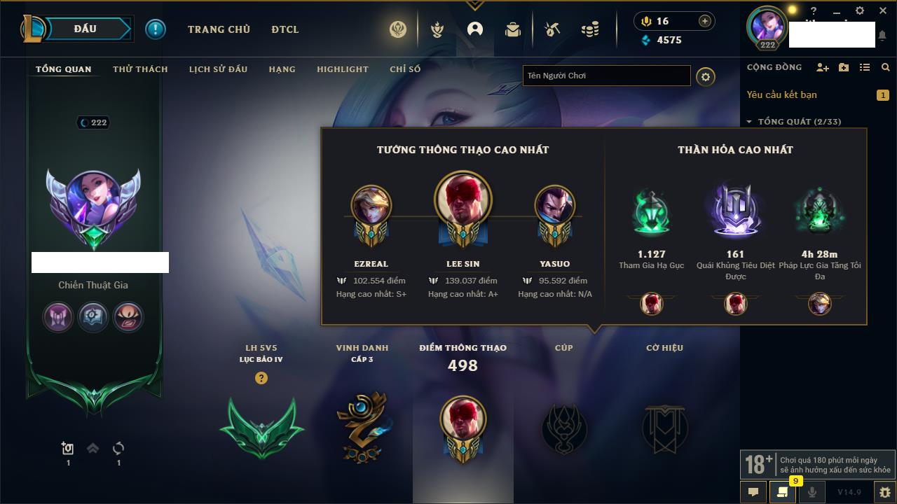 Rank Đơn: Chưa RankKhung: Chưa có khungTướng: 157 - Còn 6783 THXTrang Phục: 50Rank ĐTCL: Chưa RankLinh Thú: 37