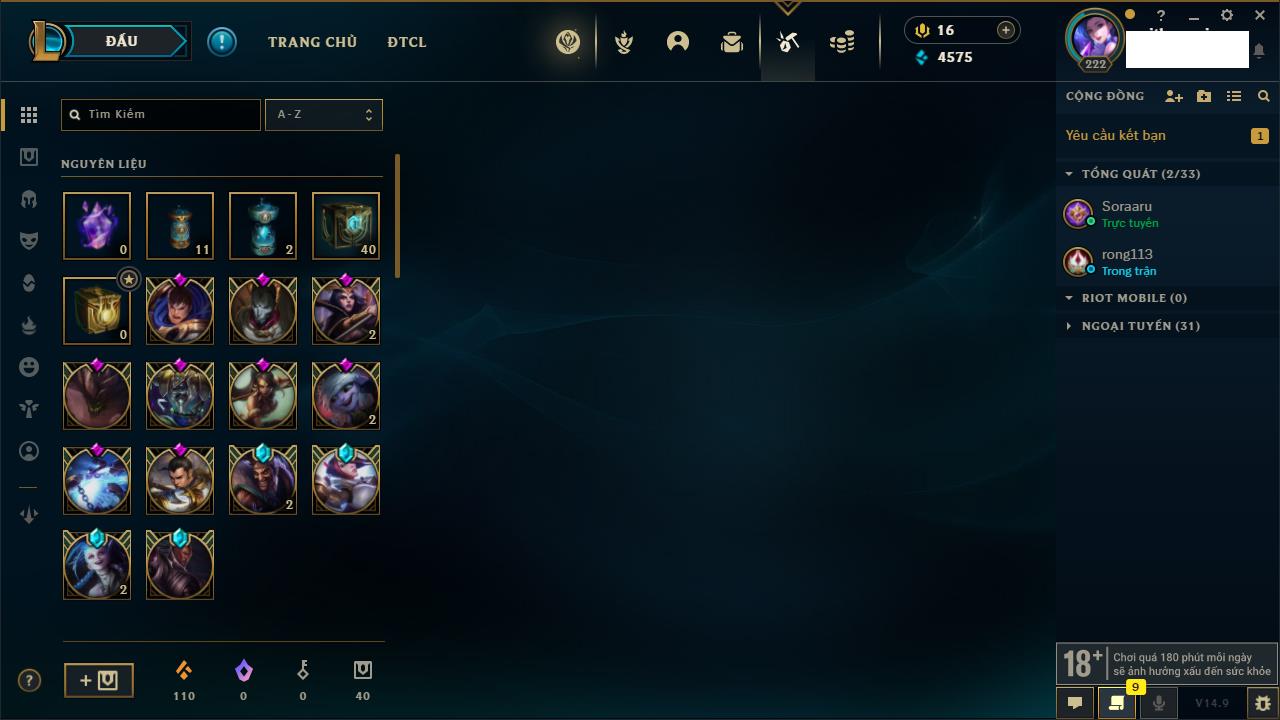 Rank Đơn: Vàng IVKhung: VàngTướng: 146 - Còn 89110 THXTrang Phục: 63Rank ĐTCL: Vàng IIILinh Thú: 41