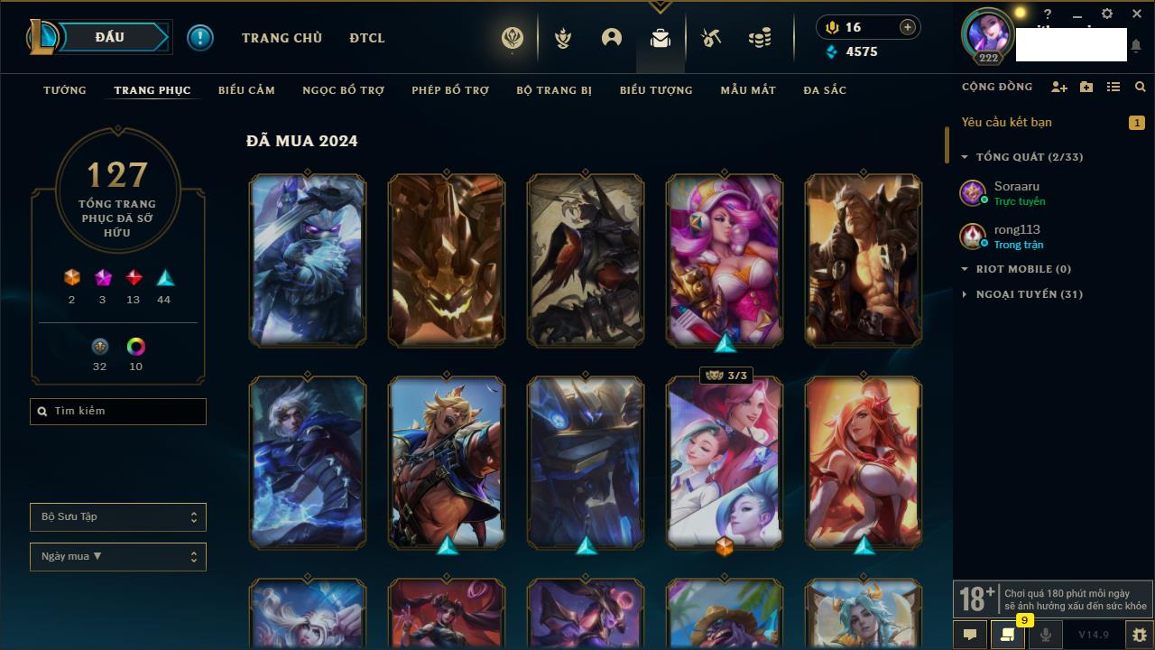 Rank Đơn: Vàng IIIKhung: VàngTướng: 170 - Còn 33222 THXTrang Phục: 136Rank ĐTCL: Chưa RankLinh Thú: 40