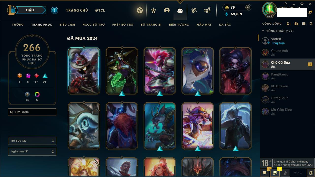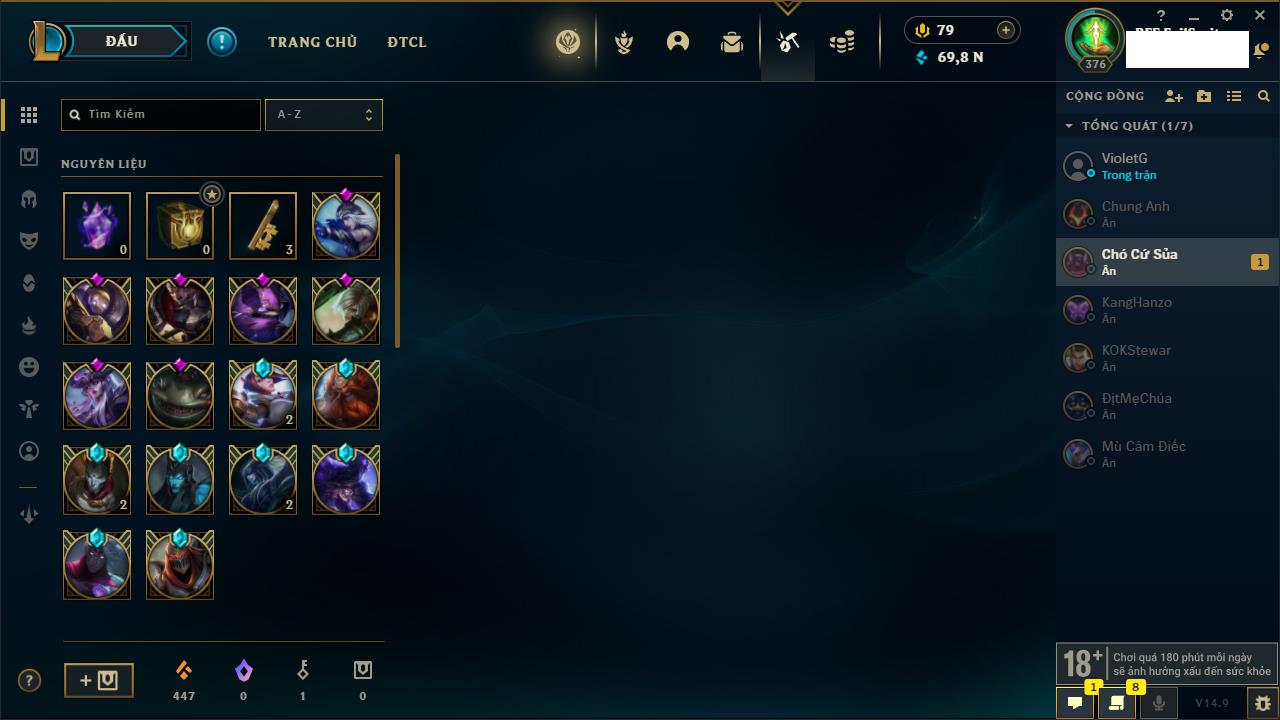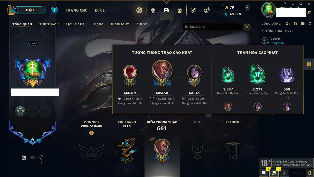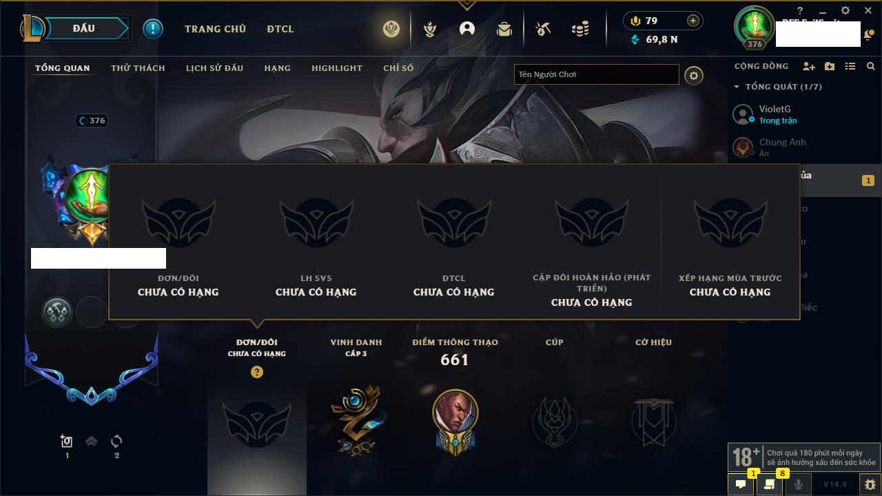 Rank Đơn: Vàng IIKhung: VàngTướng: 171 - Còn 34018 THXTrang Phục: 250Rank ĐTCL: Sắt IILinh Thú: 19