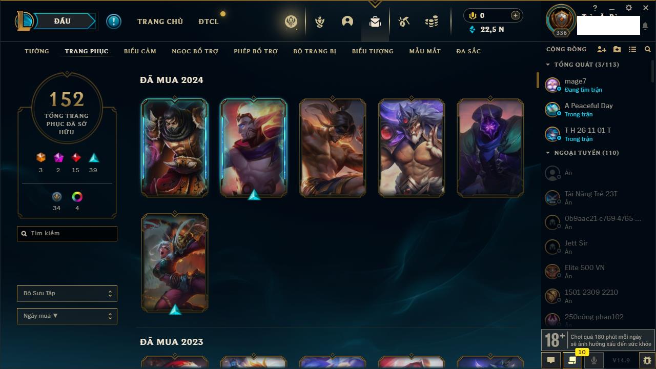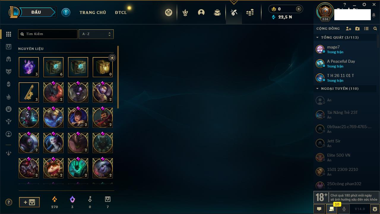 Rank Đơn: Chưa RankKhung: Chưa có khungTướng: 162 - Còn 23234 THXTrang Phục: 150Rank ĐTCL: Chưa RankLinh Thú: 42
