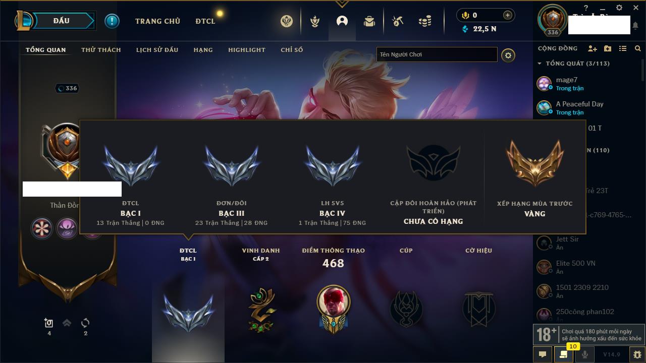Rank Đơn: Chưa RankKhung: Chưa có khungTướng: 154 - Còn 18477 THXTrang Phục: 127Rank ĐTCL: Vàng ILinh Thú: 183
