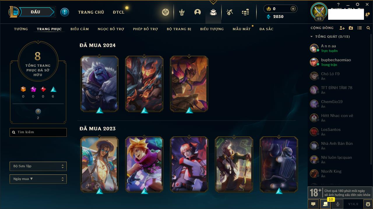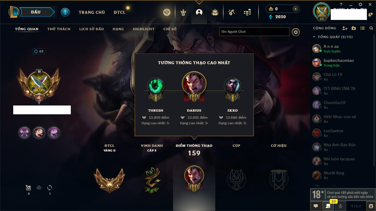 Rank Đơn: Chưa RankKhung: Chưa có khungTướng: 118 - Còn 13712 THXTrang Phục: 117Rank ĐTCL: Chưa RankLinh Thú: 34