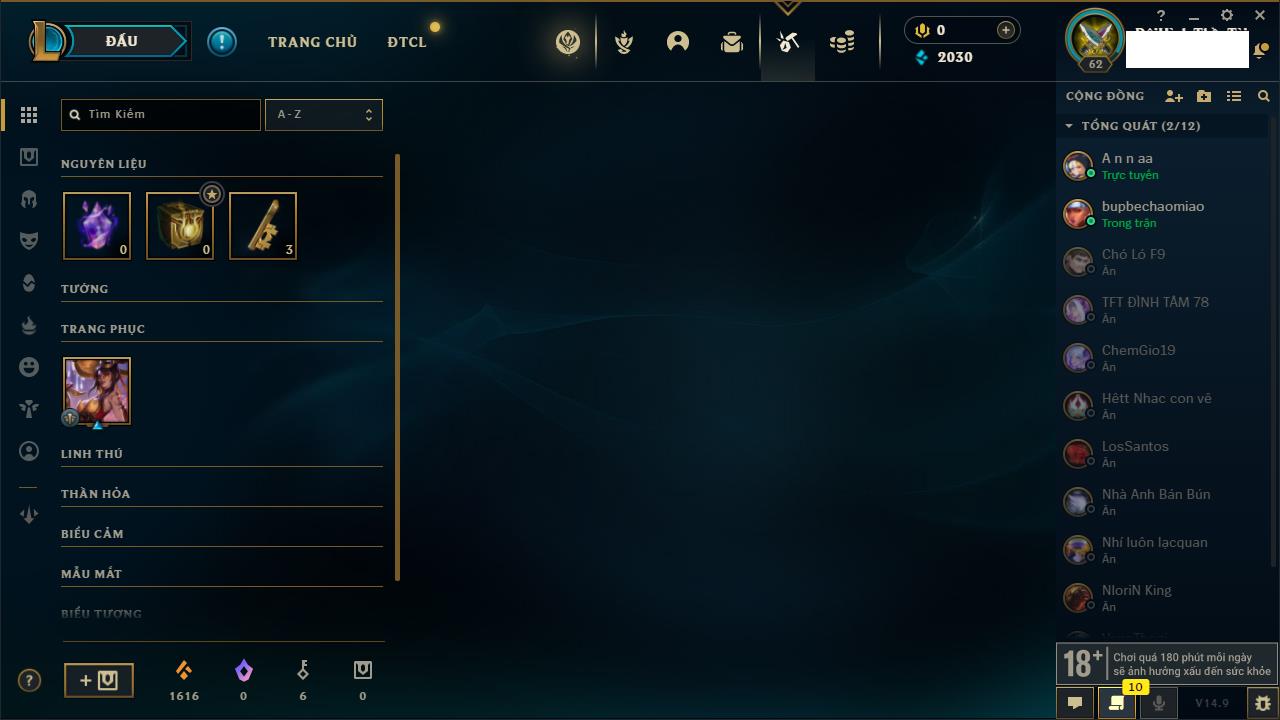 Rank Đơn: Chưa RankKhung: Chưa có khungTướng: 37 - Còn 27387 THXTrang Phục: 10Rank ĐTCL: Chưa RankLinh Thú: 1