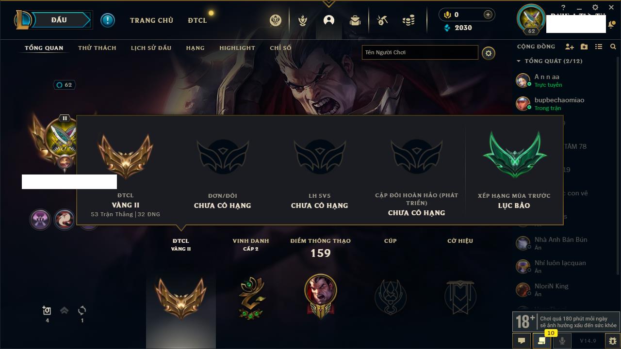 Rank Đơn: Chưa RankKhung: Chưa có khungTướng: 165 - Còn 3214 THXTrang Phục: 160Rank ĐTCL: Chưa RankLinh Thú: 28