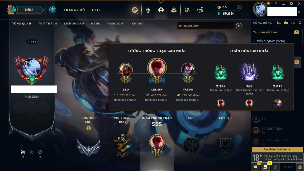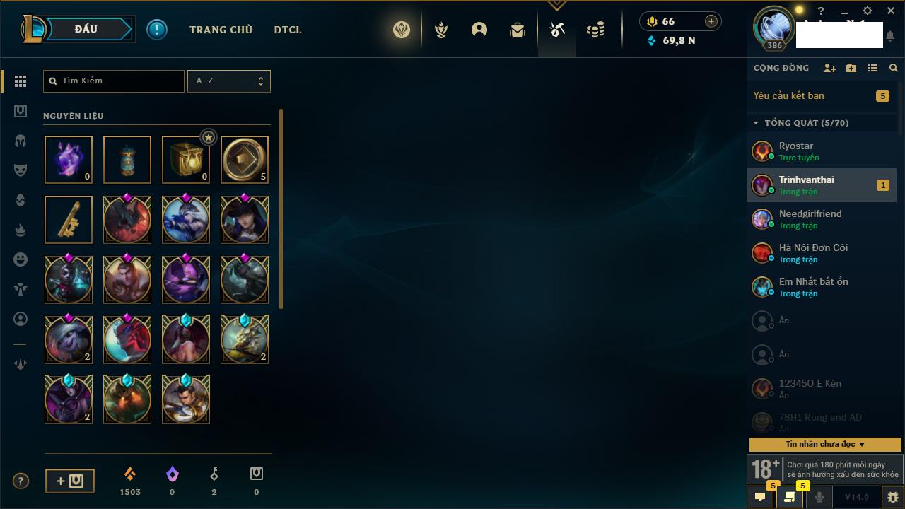 Rank Đơn: Đồng IIKhung: Chưa có khungTướng: 170 - Còn 56487 THXTrang Phục: 90Rank ĐTCL: Chưa RankLinh Thú: 129