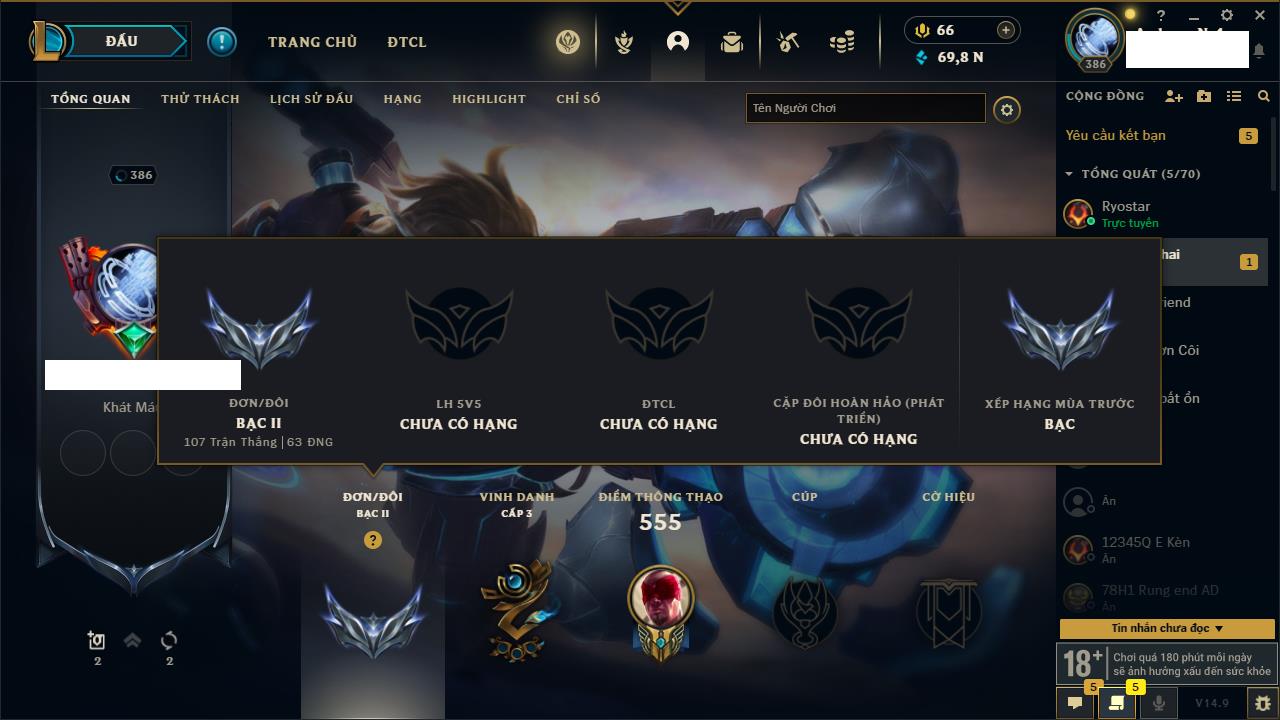 Rank Đơn: Vàng IVKhung: VàngTướng: 146 - Còn 89110 THXTrang Phục: 63Rank ĐTCL: Vàng IIILinh Thú: 41