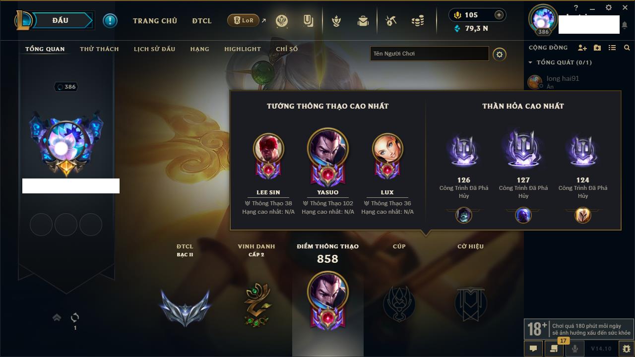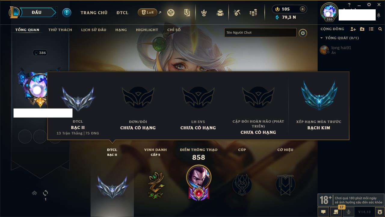 Rank Đơn: Bạc IVKhung: BạcTướng: 171 - Còn 161685 THXTrang Phục: 139Rank ĐTCL: Đồng ILinh Thú: 51