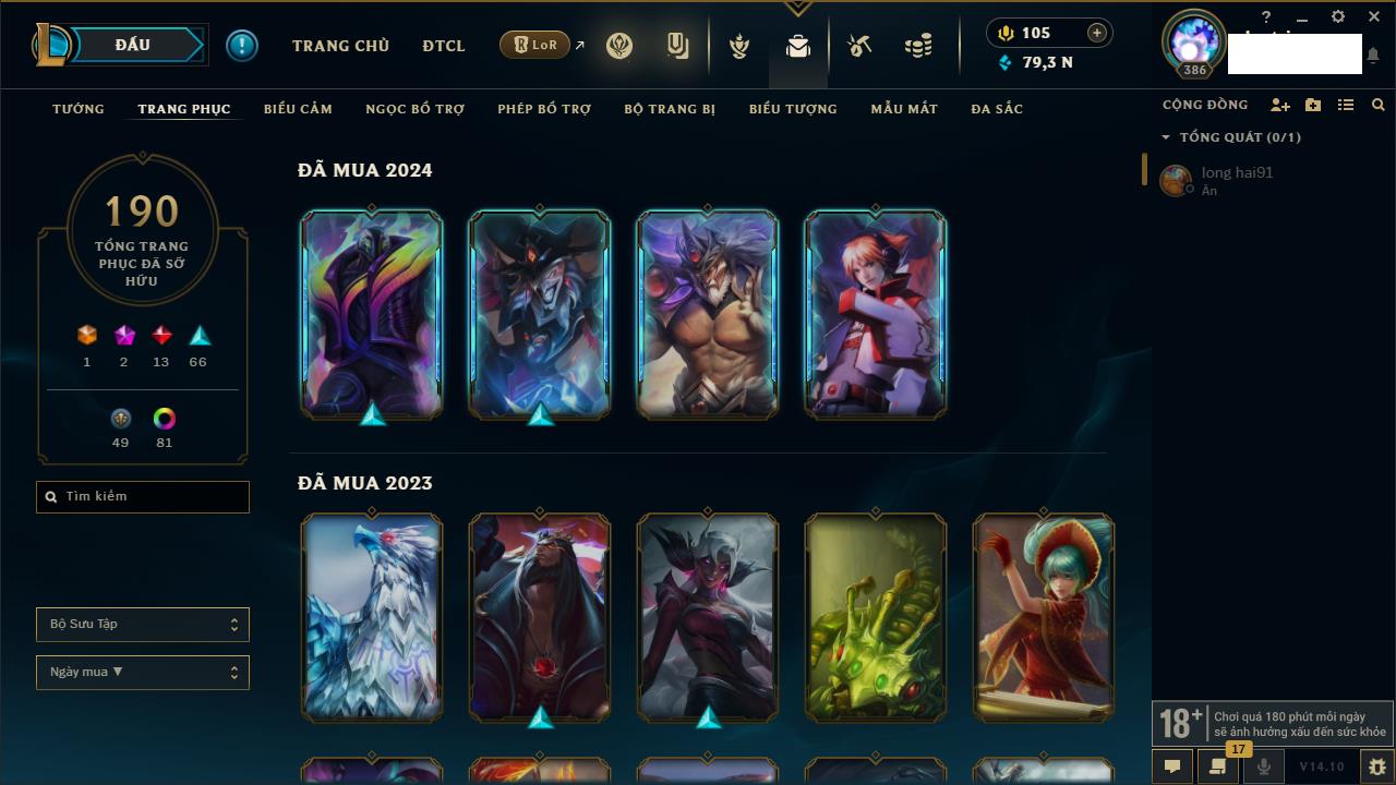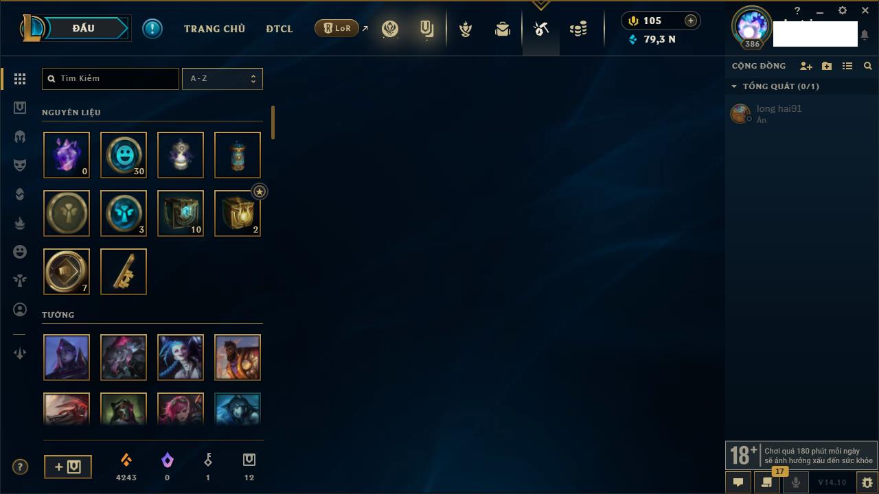 Rank Đơn: Bạc IVKhung: BạcTướng: 171 - Còn 102637 THXTrang Phục: 169Rank ĐTCL: Vàng IILinh Thú: 127