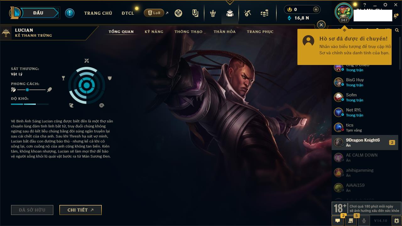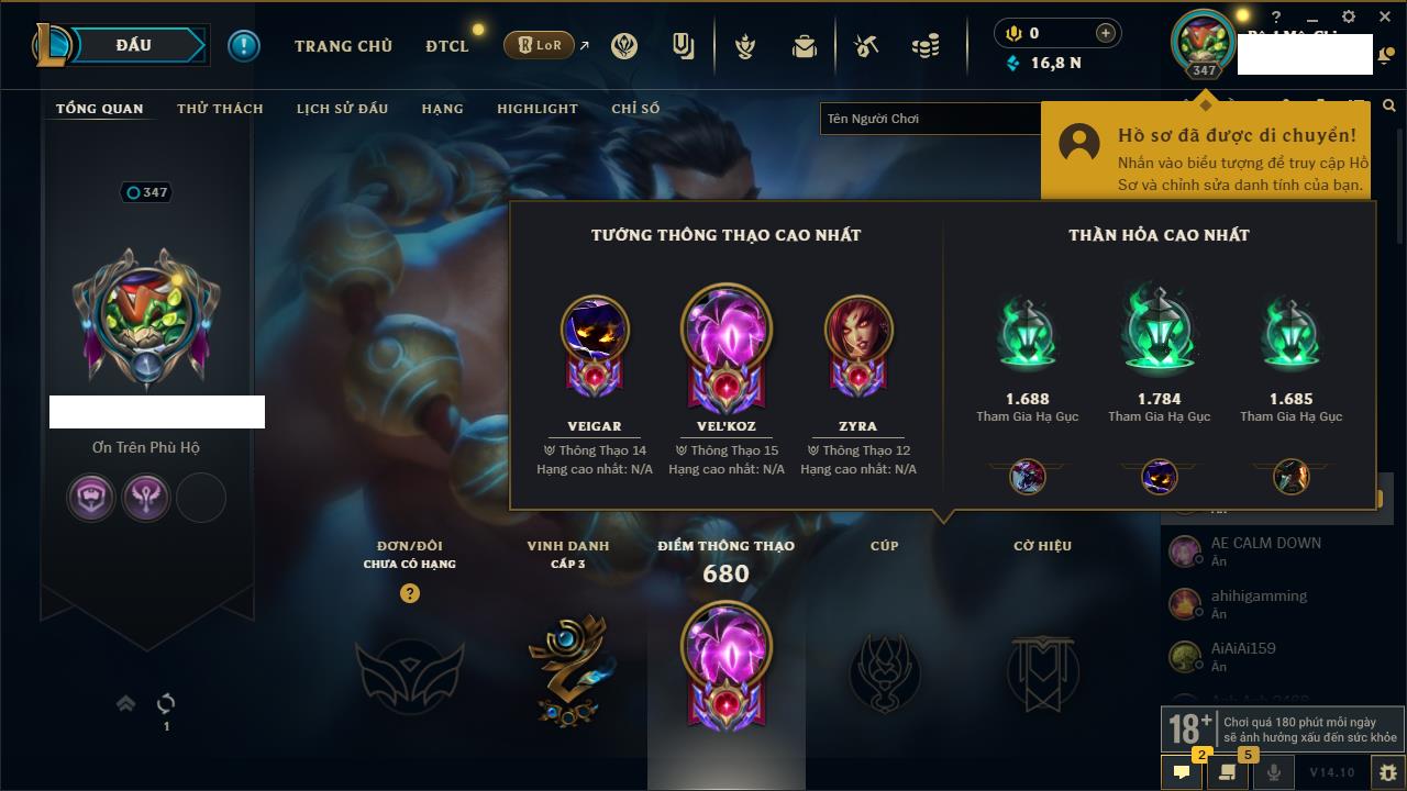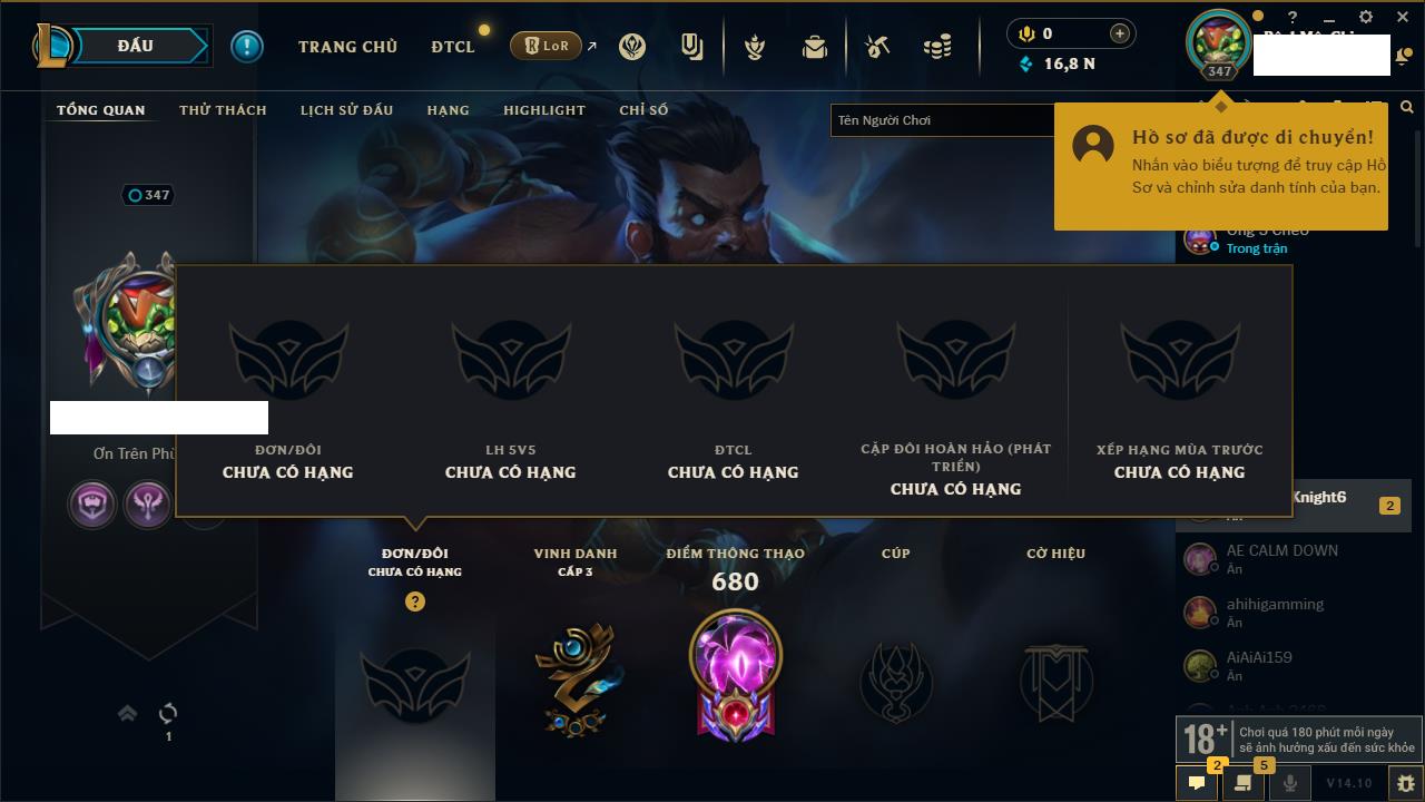 Rank Đơn: Chưa RankKhung: Chưa có khungTướng: 157 - Còn 6783 THXTrang Phục: 50Rank ĐTCL: Chưa RankLinh Thú: 37