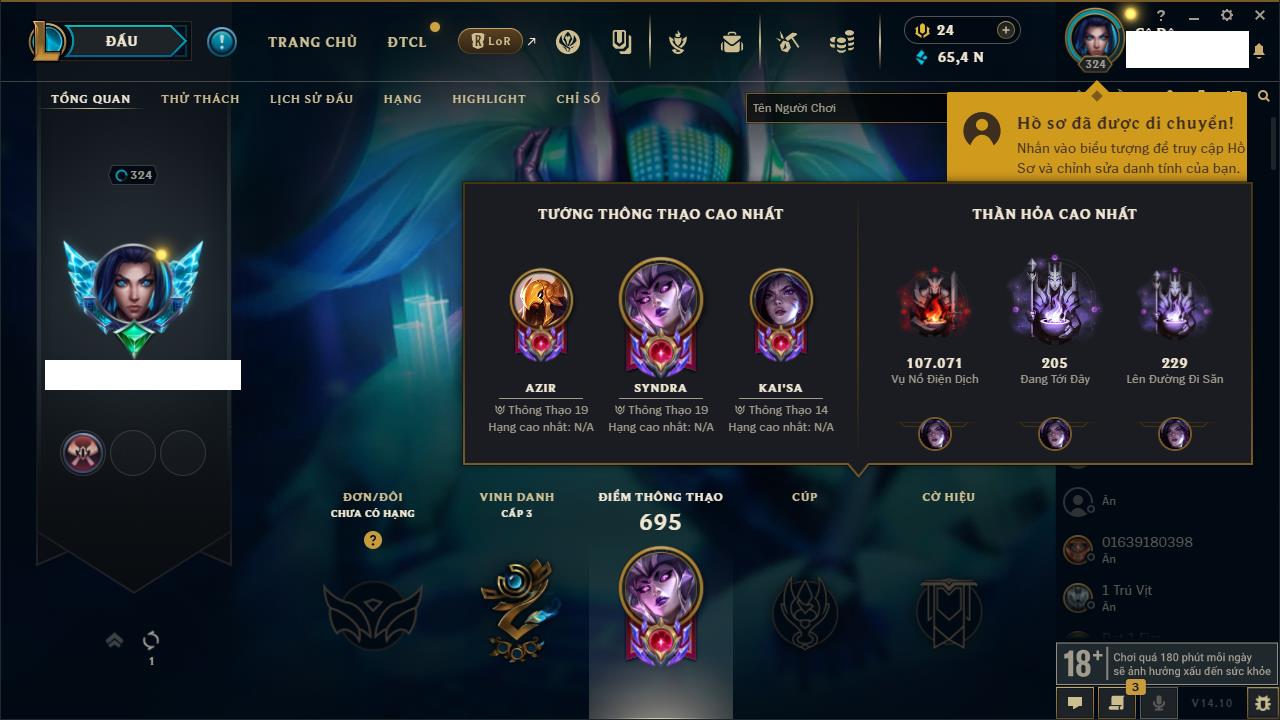 Rank Đơn: Chưa Rank Khung: Chưa có khung Tướng: 157 - Còn 51905 THX Trang Phục: 3 Rank ĐTCL: Chưa Rank Linh Thú: 175
